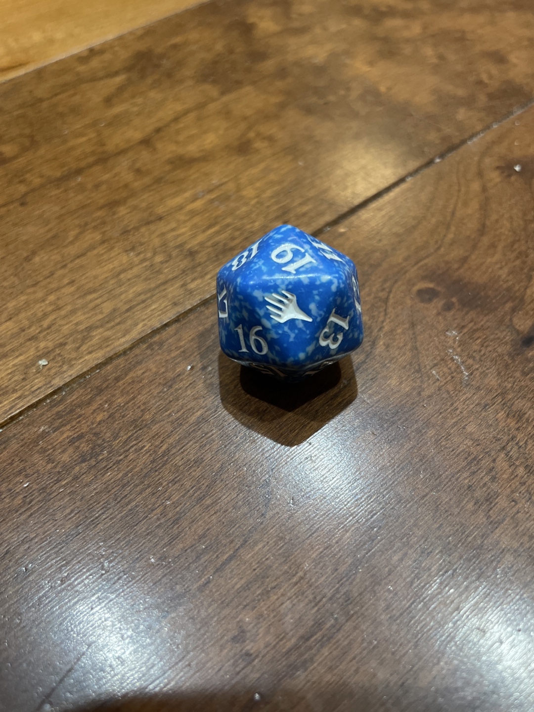 Here's a blue 20-sided die from Magic the Gathering. It has white speckles and the Magic The Gathering logo on one side. Great for keeping track of life totals or other counters while playing!