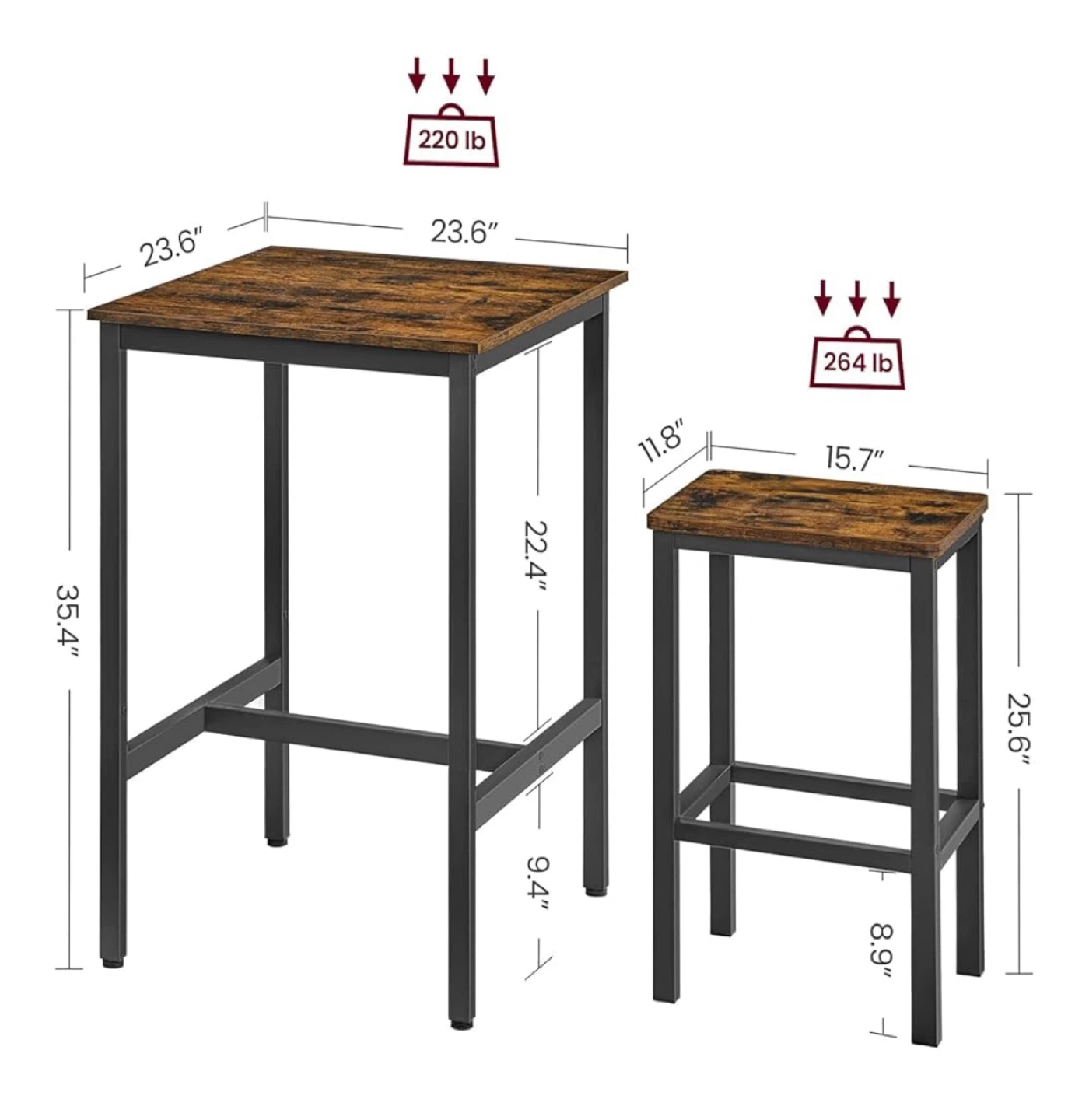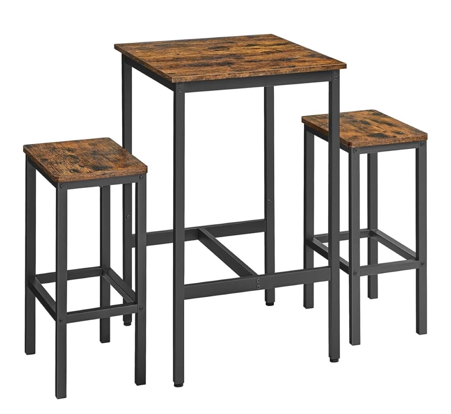 This rustic brown bar table set comes with two matching stools! The table is 23.6" x 23.6" and stands 35.4" tall. Each stool is 15.7" x 11.8" and 25.6" high. Perfect for a small kitchen or dining area!