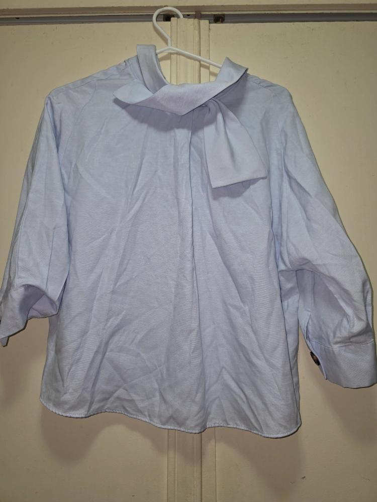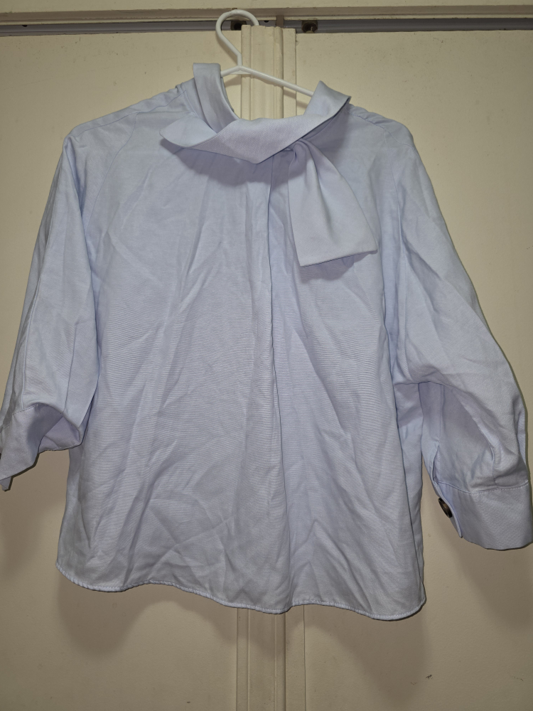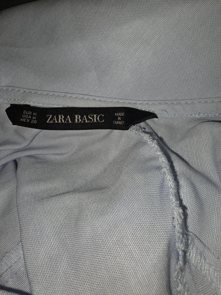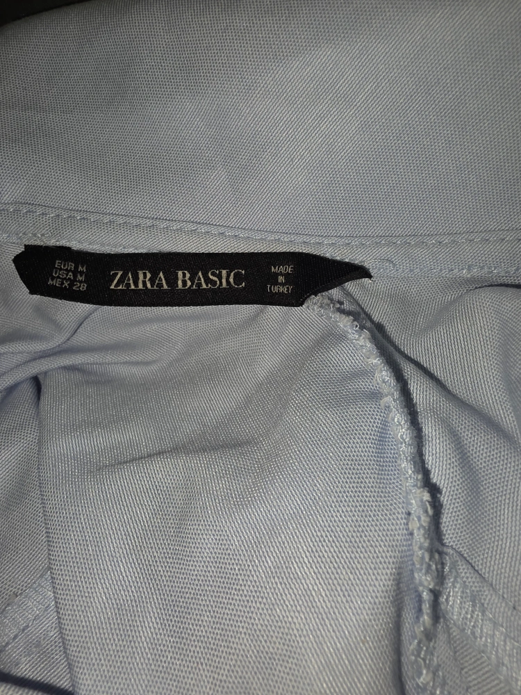 Here's a Zara Basic blouse in size M. It's a light blue colour and made in Turkey. Great for a casual or dressed-up look!