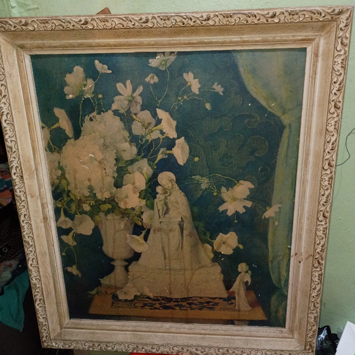 This is a vintage framed print featuring a floral arrangement and figures. The frame has an ornate design. It's a beautiful piece to add to your home decor!