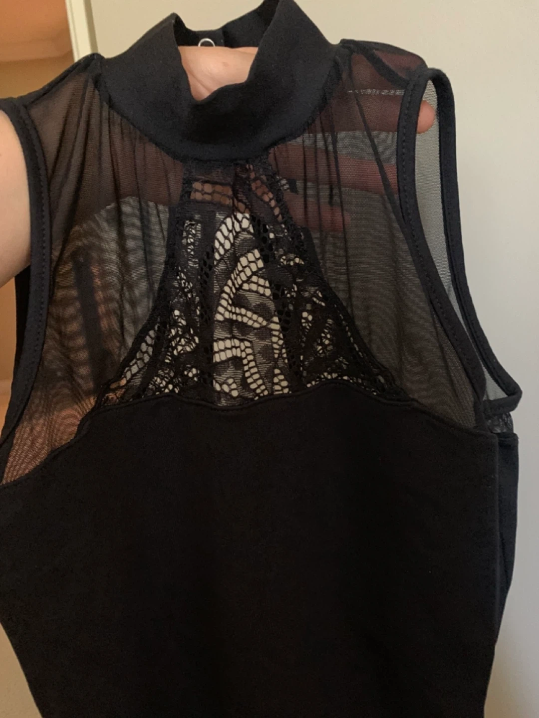 Selling a black leotard with a mesh and lace design. It has a high neck with button closure at the back. Perfect for dance or as a costume