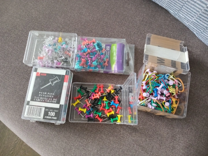 I have a collection of push pins and paper clips for sale! There are various colours and sizes available. One of the boxes is from ACCO and contains 100 push pins. Great for office or home use
