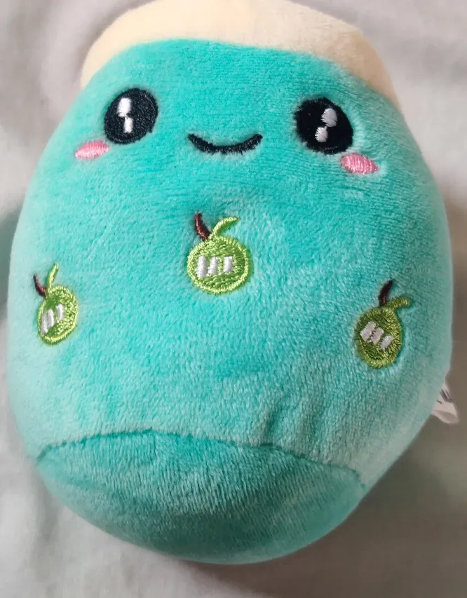 This is a super cute plush bb tea keychain. It's a soft, turquoise colour and has little embroidered apple designs on it. Perfect for hanging on your bag or backpack. Pick from Richmond only.