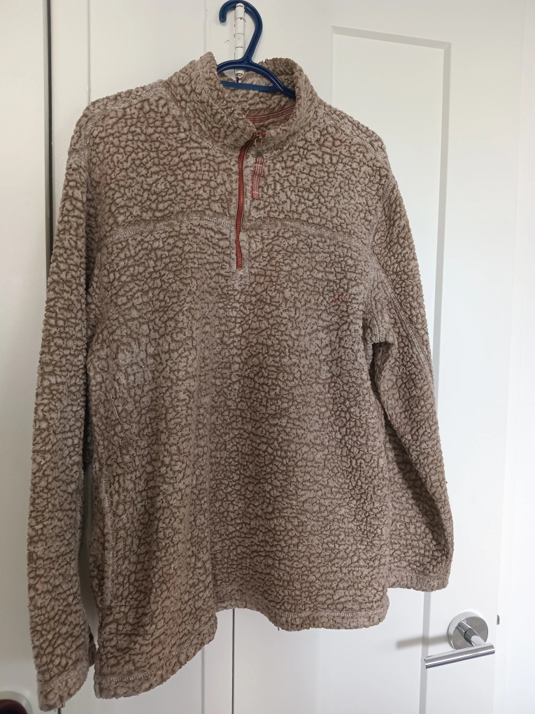 A cozy fuzzy brown pullover! It's in great condition and perfect for layering on chilly days. The material is soft and warm, making it super comfy to wear. It features a quarter-zip closure with a red zipper.