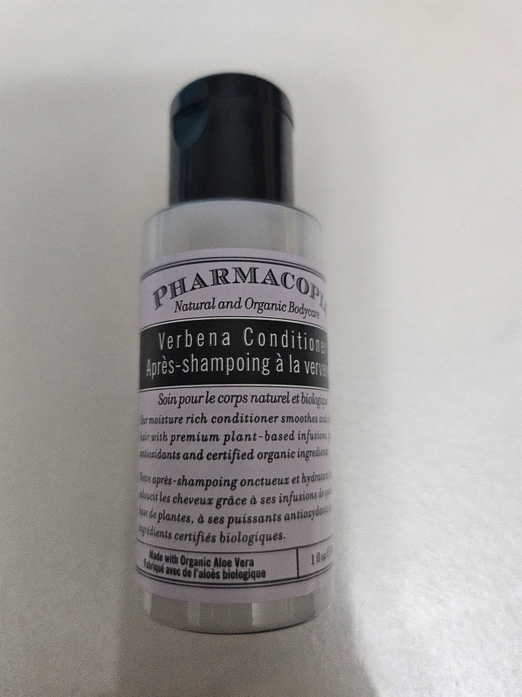 bottle of Pharmacopia Verbena Conditioner. It's a natural and organic bodycare product that smooths and hydrates hair with premium plant-based infusions, antioxidants, and certified organic ingredients. It's made with organic aloe vera and comes in a 1 fl oz bottle