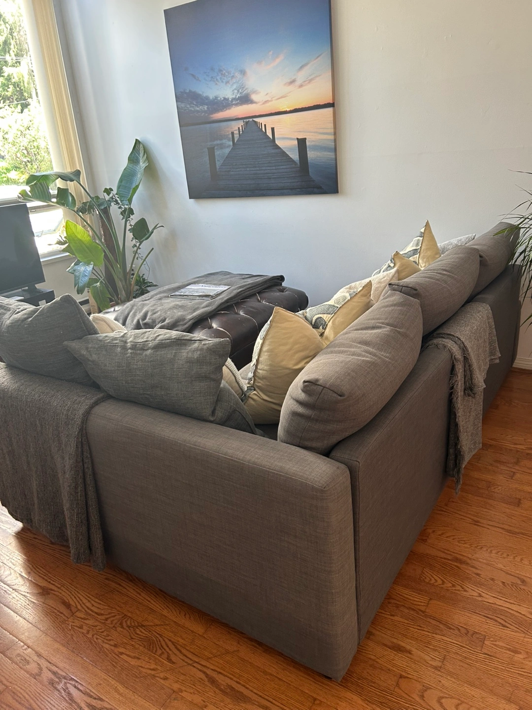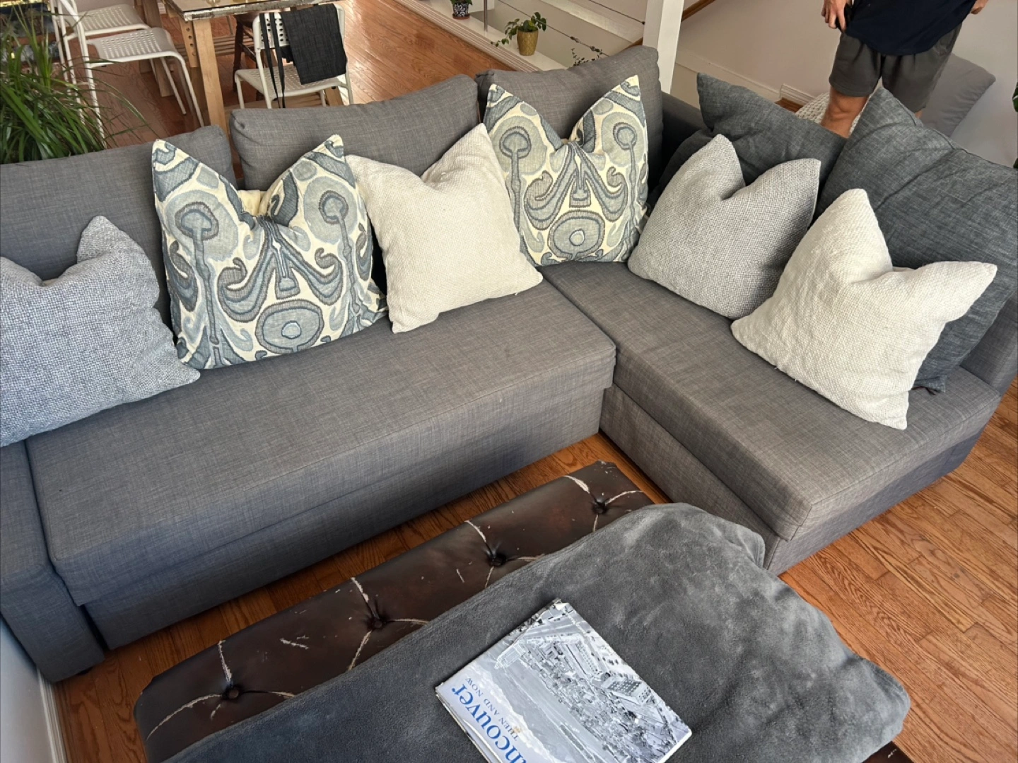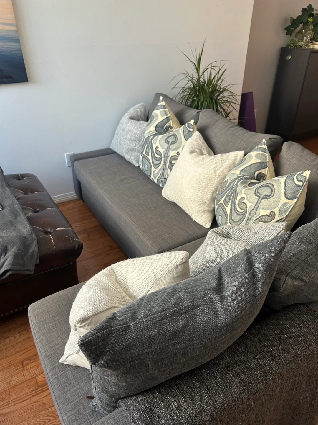 Selling a comfy grey sectional sofa! It's in great condition and ready for a new home. Perfect for lounging and adding a stylish touch to any living space. It features a modular design that can be arranged to fit your space and comes with an assortment of decorative pillows