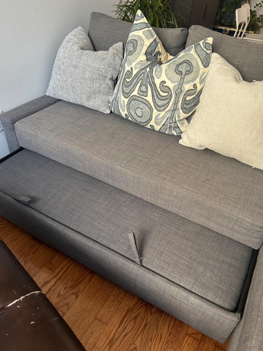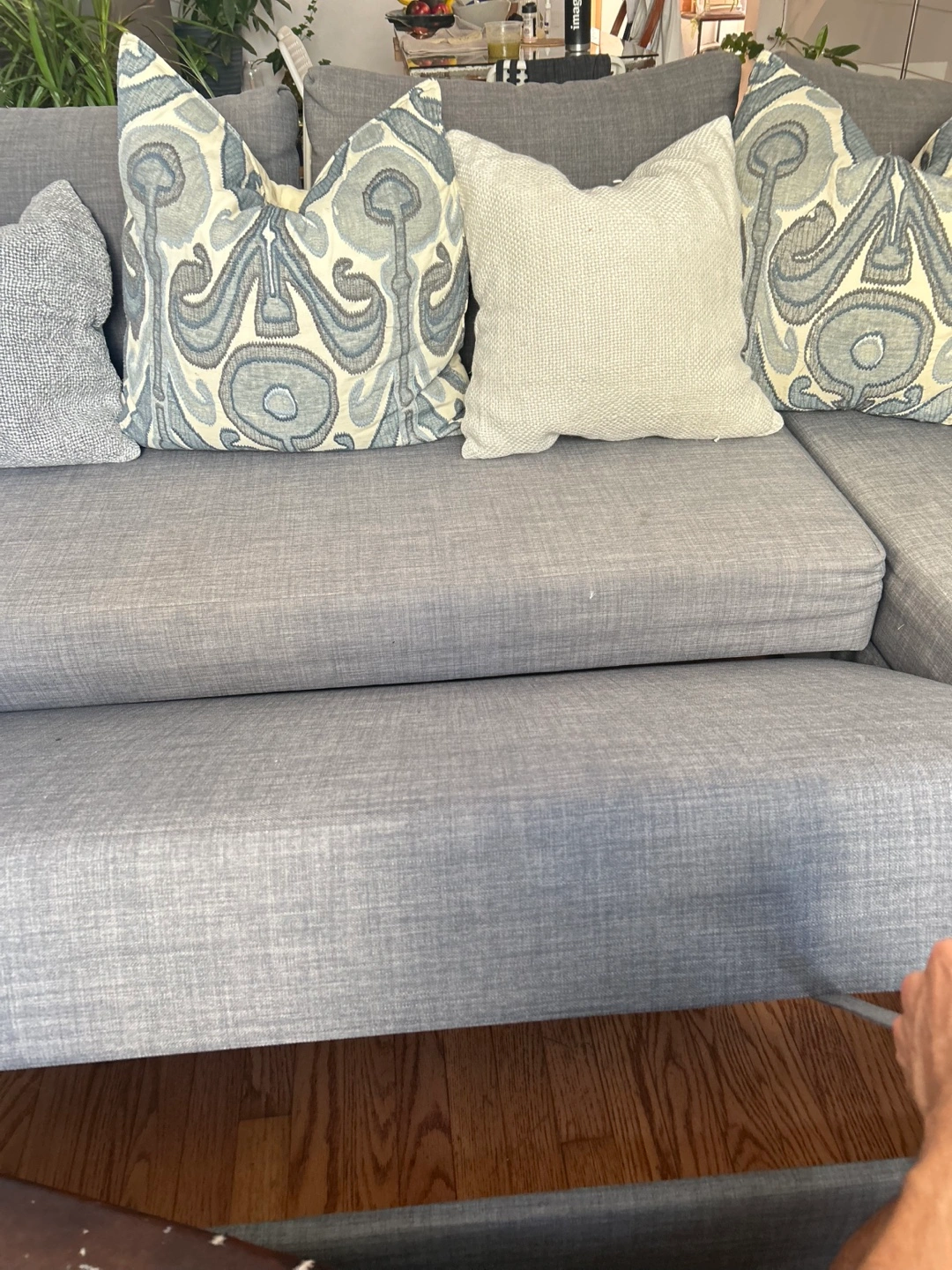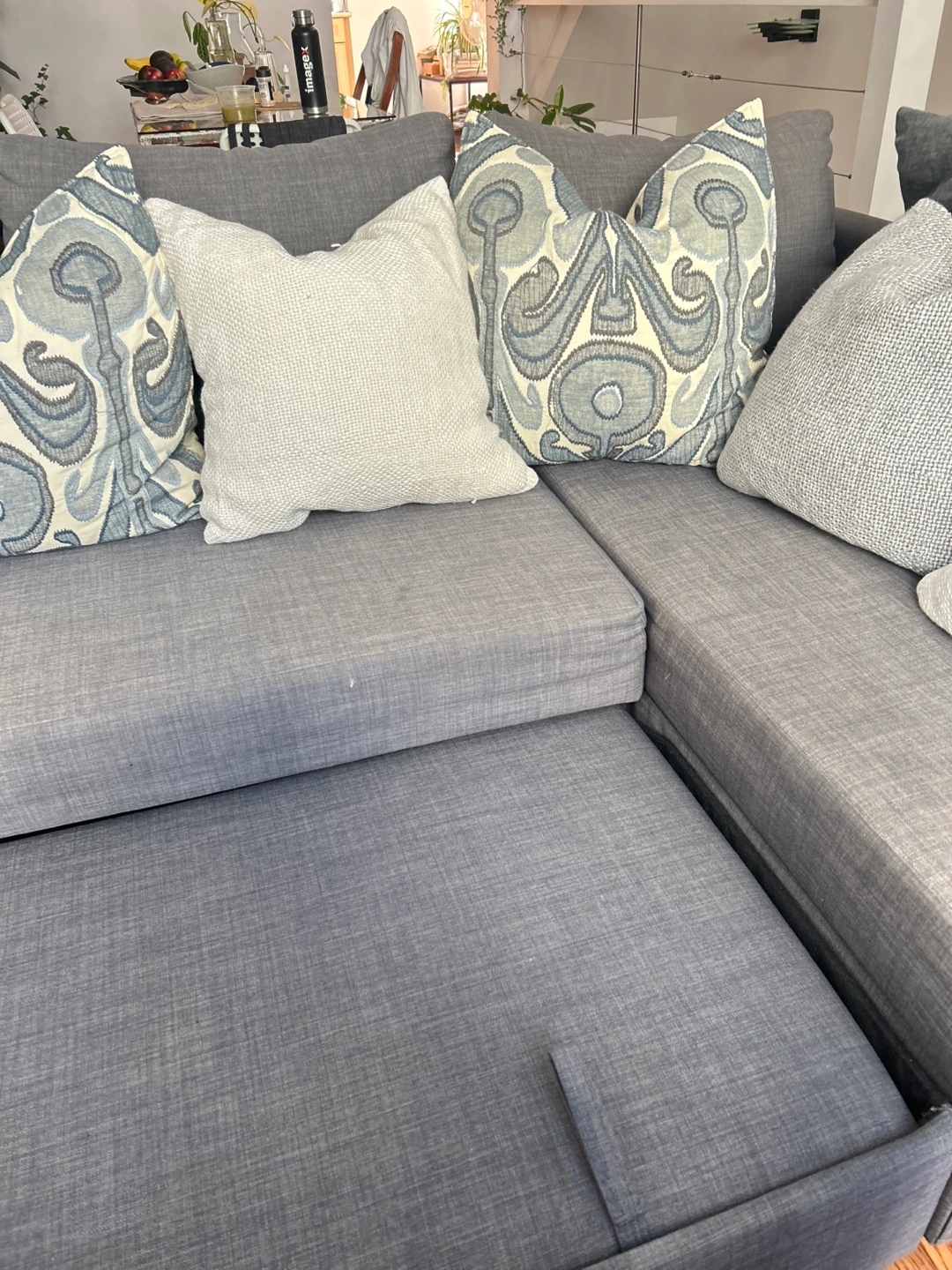 Selling a comfy grey sectional sofa! It's in great condition and ready for a new home. Perfect for lounging and adding a stylish touch to any living space. It features a modular design that can be arranged to fit your space and comes with an assortment of decorative pillows