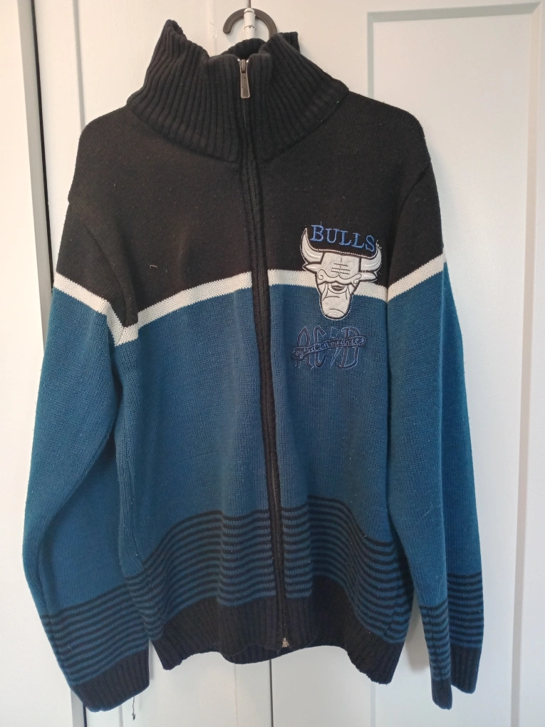 Cozy Chicago Bulls knit sweater with a full zip. It features the Bulls logo and a unique colour block design in black and blue. Great for showing off your team spirit!
