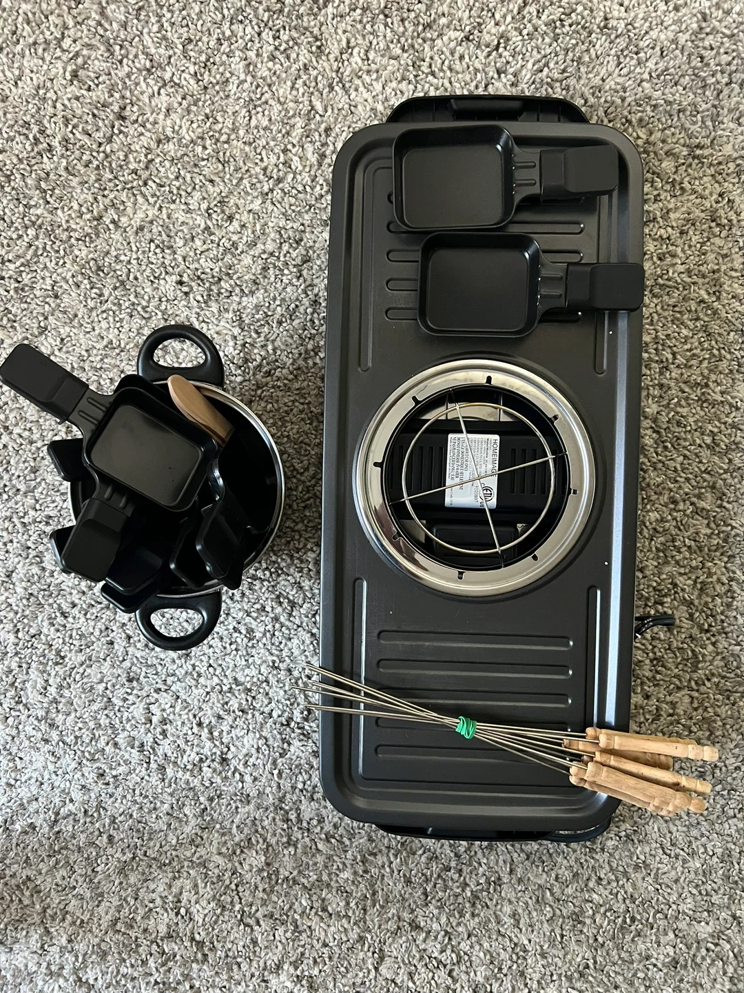 Selling a raclette grill set! It comes with everything you need for a fun and delicious raclette night. Included are the grill, individual raclette pans, skewers, and a hot pot for melting cheese or broth. Perfect for gatherings with friends and family!