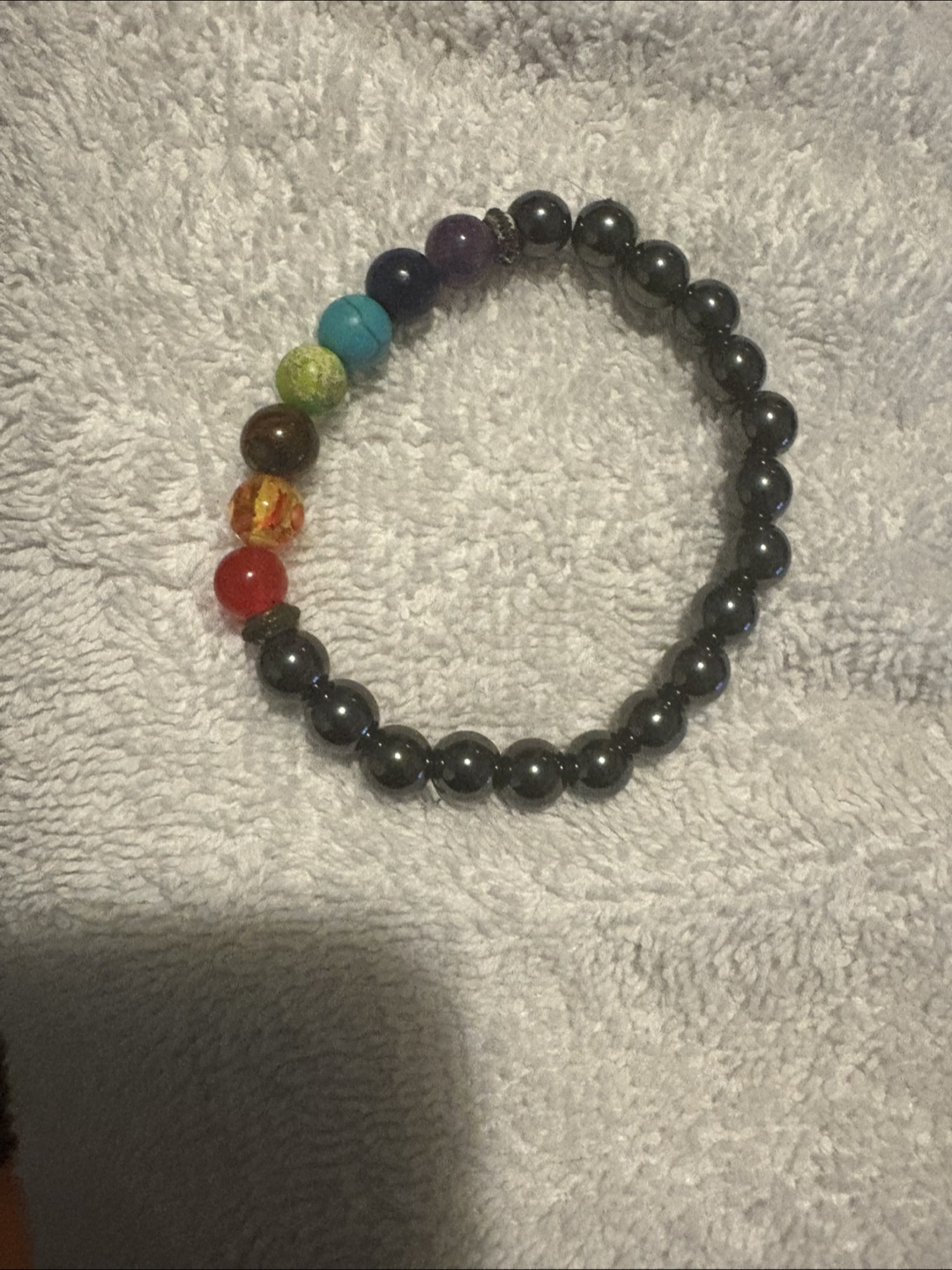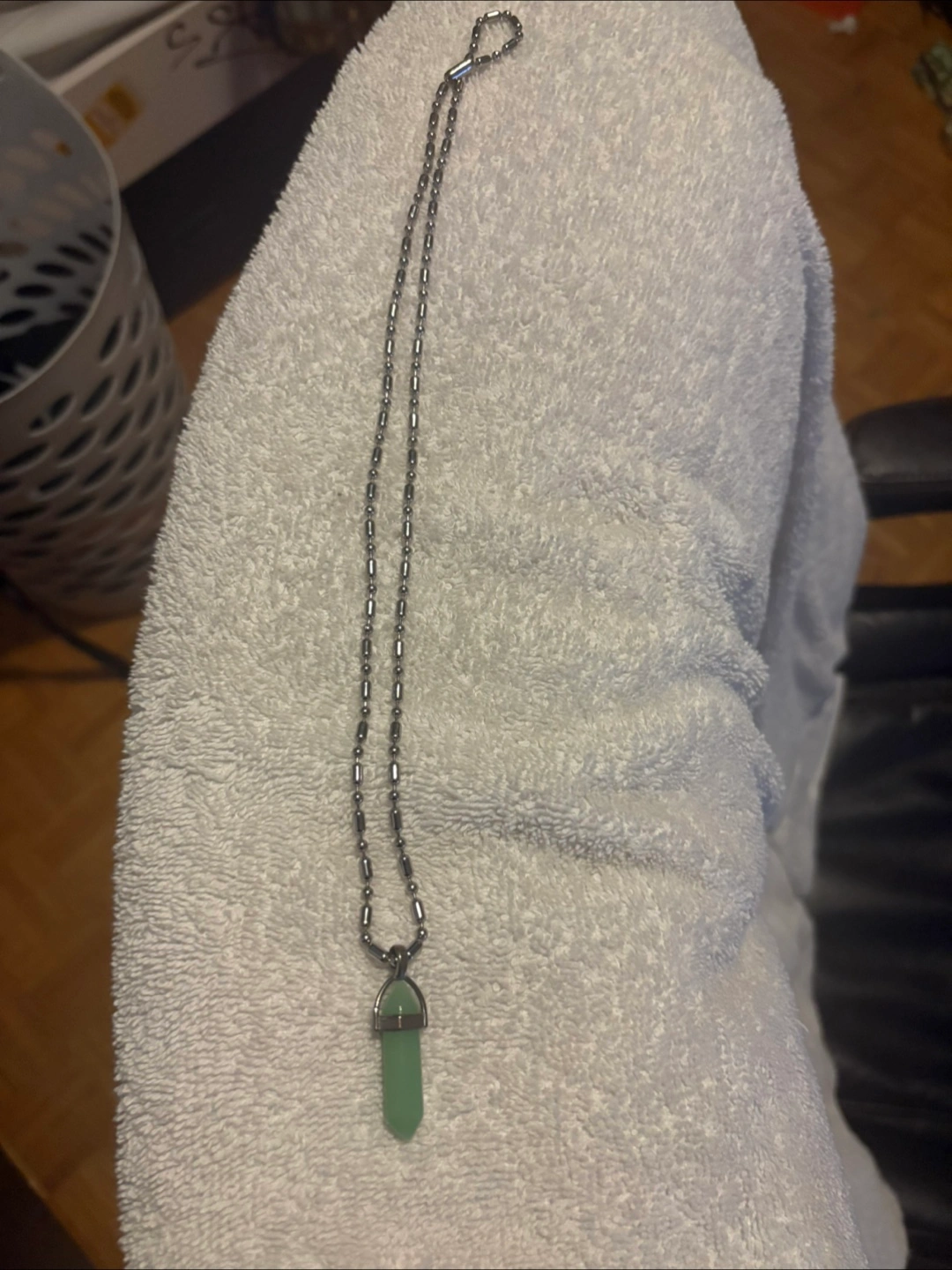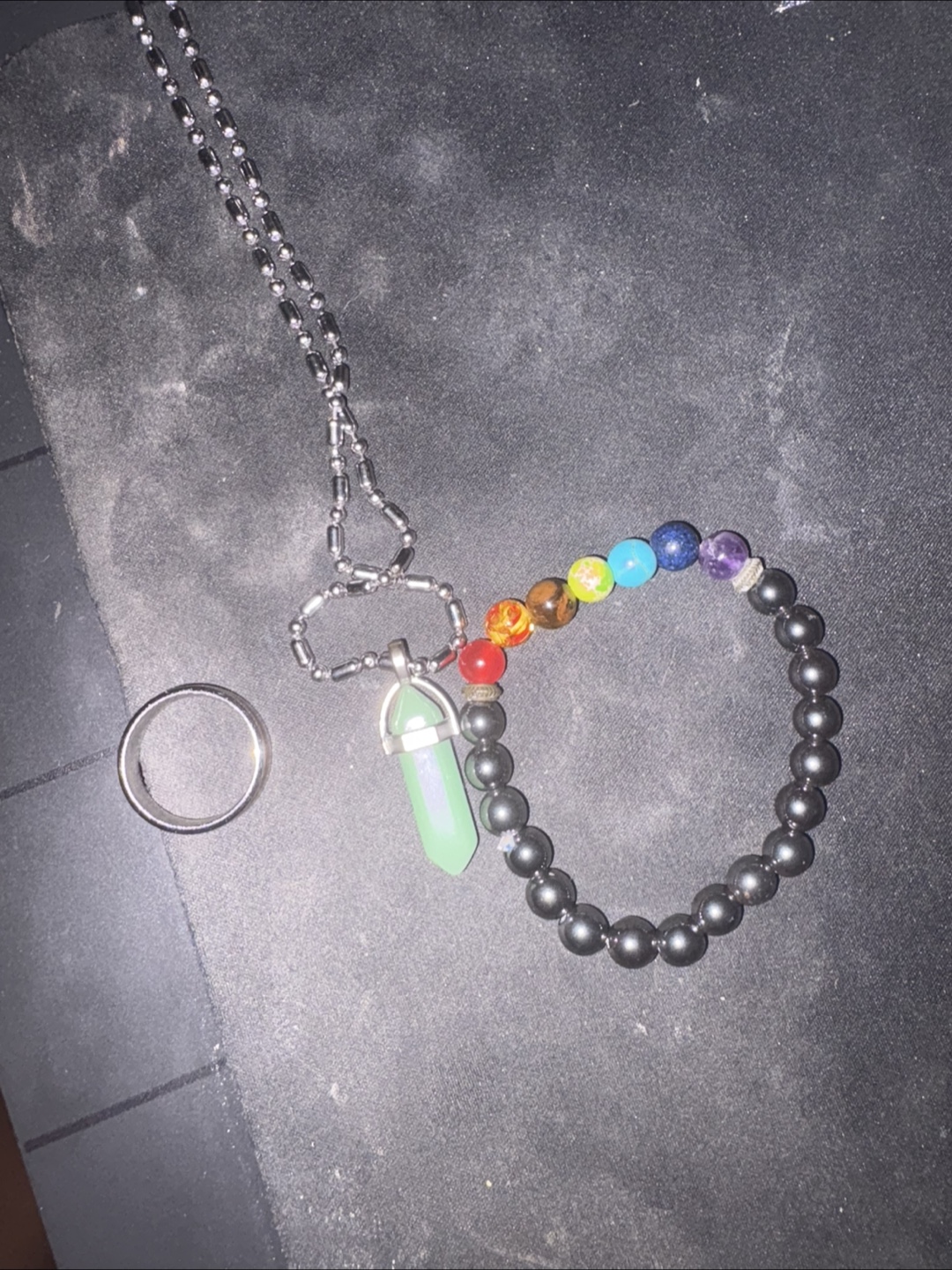 Selling a collection of jewellery. Included is a ring with a wooden inlay, a necklace with a green crystal pendant, and a beaded bracelet with chakra stones. All in good condition!