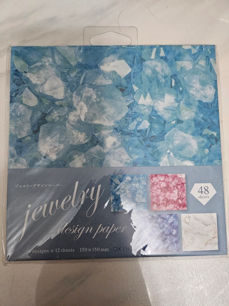 I'm selling a pack of jewelry design paper! It includes 48 sheets with 4 different designs. Each sheet measures 150x150 mm. Perfect for crafting and designing your own jewelry displays or projects