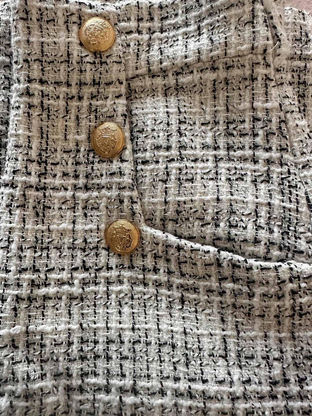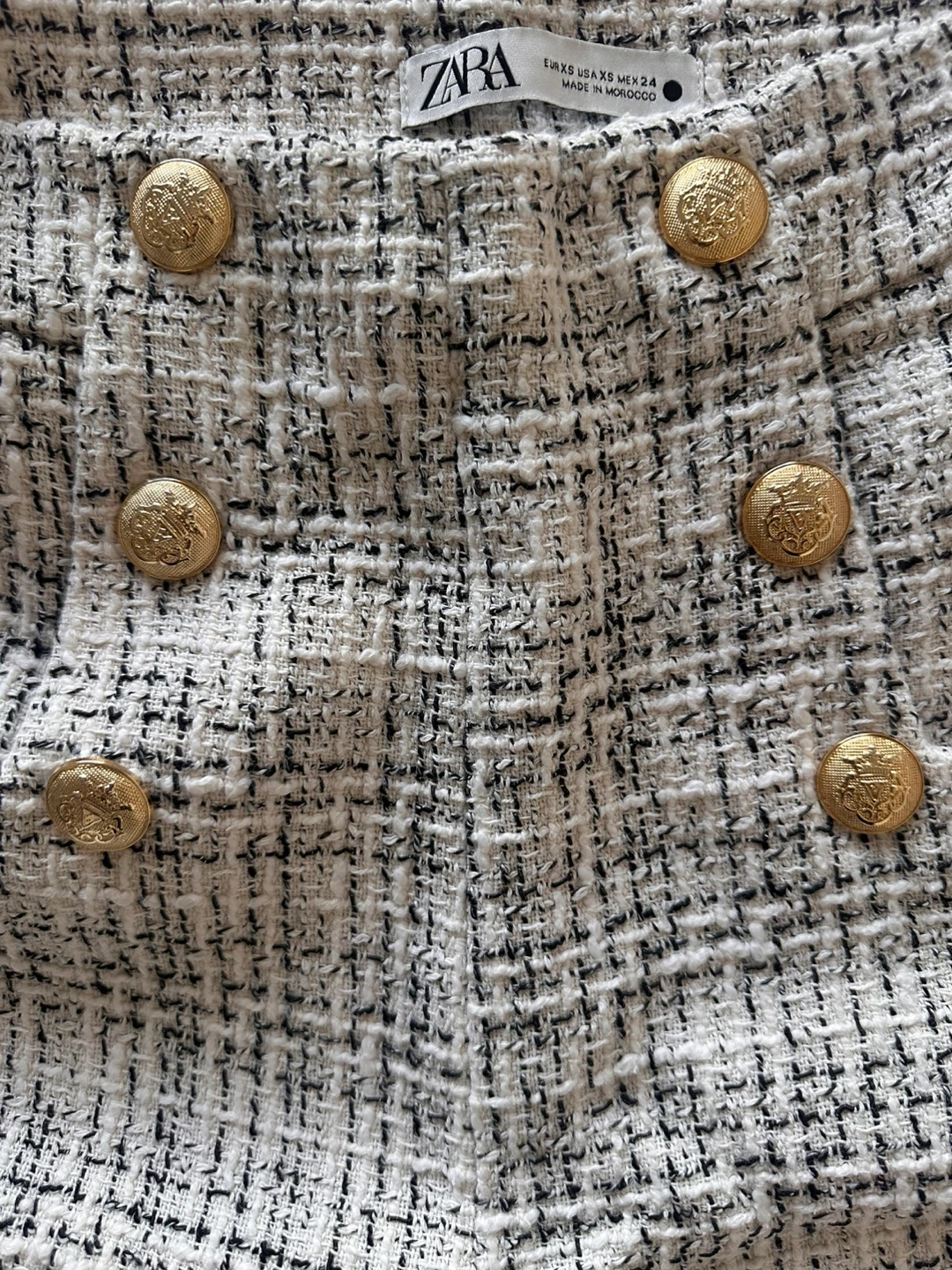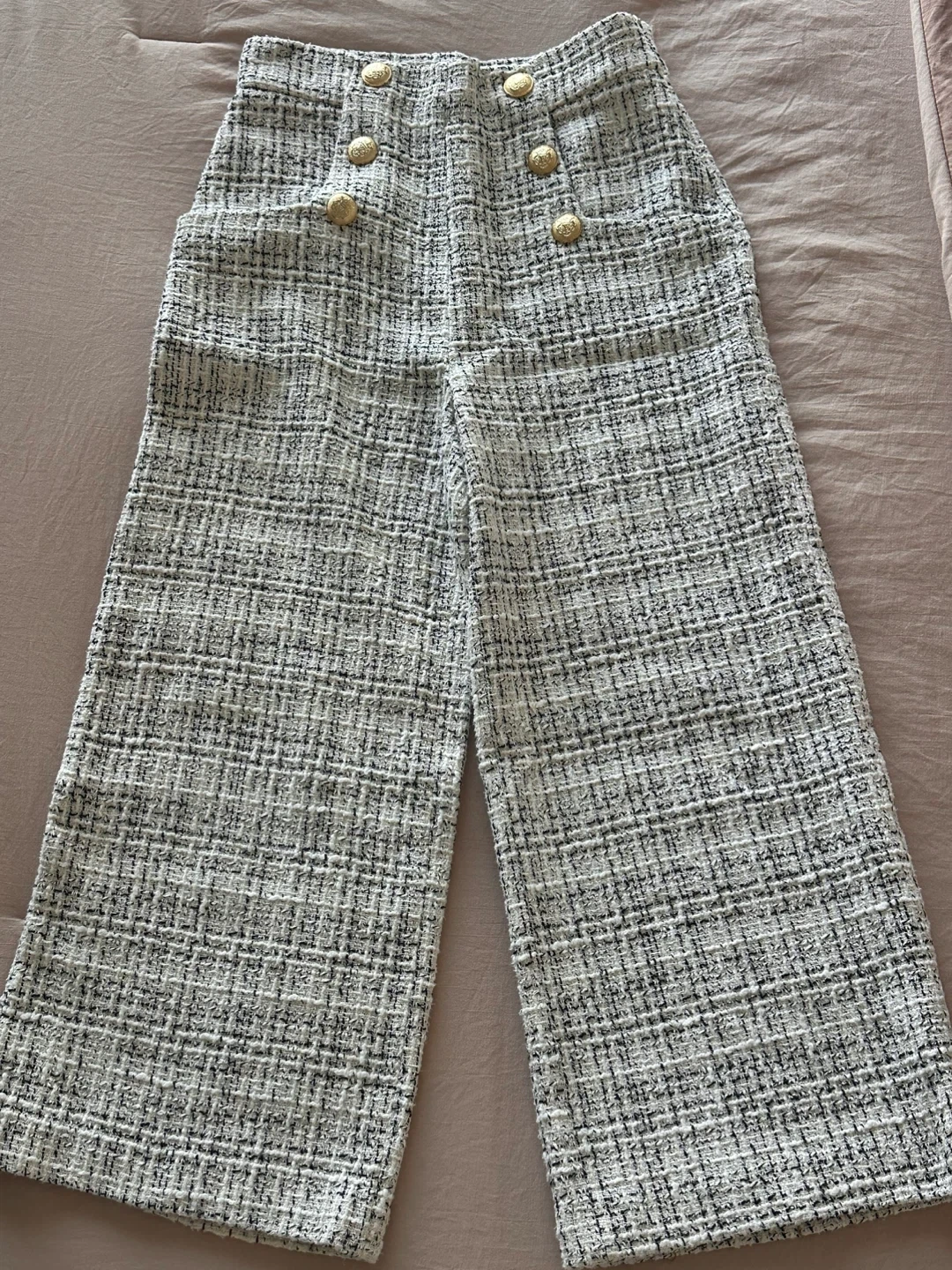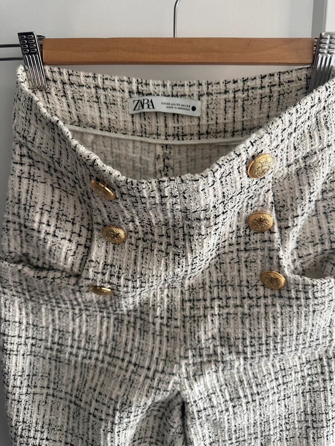 25cad ….These are a pair of Zara tweed pants. They are size XS and feature gold buttons. The material is a black and white tweed. They are in great condition!