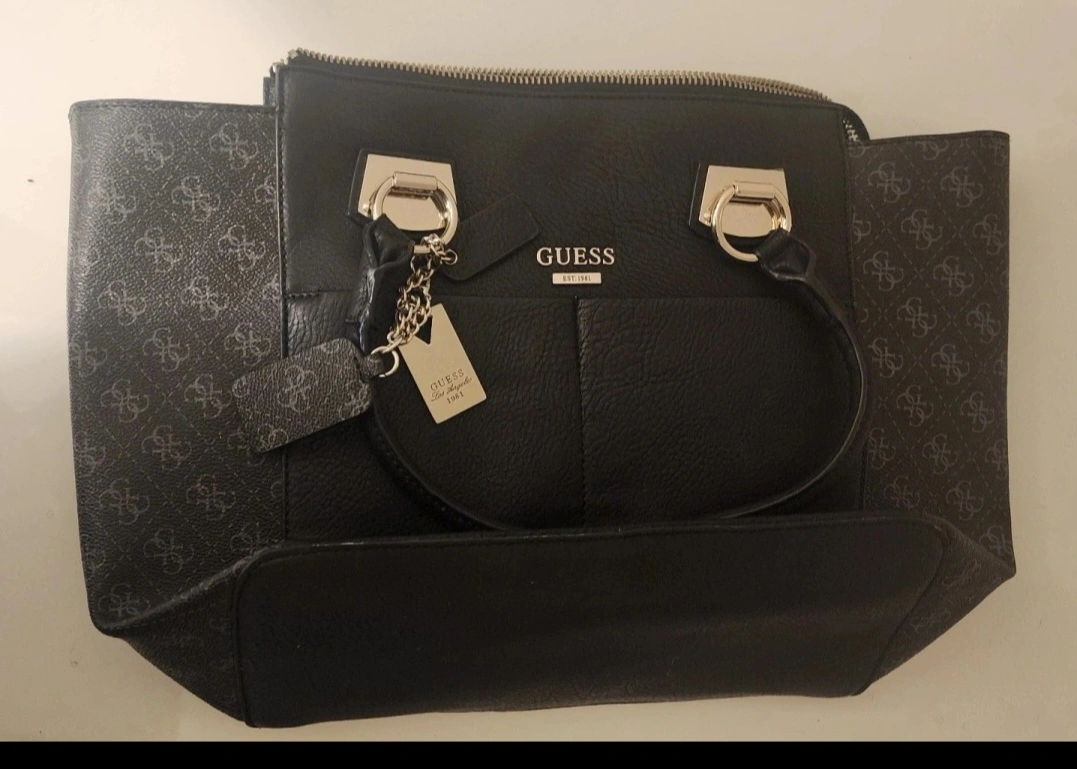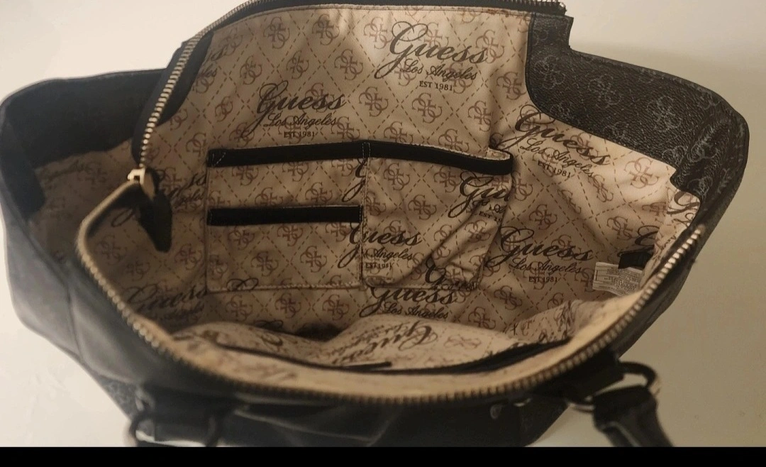 Selling a GUESS Est 1981 tote bag in black. It features the GUESS logo pattern on the sides and lining. The bag has a zippered closure, interior pockets, and silver-tone hardware. It's a stylish and functional accessory!