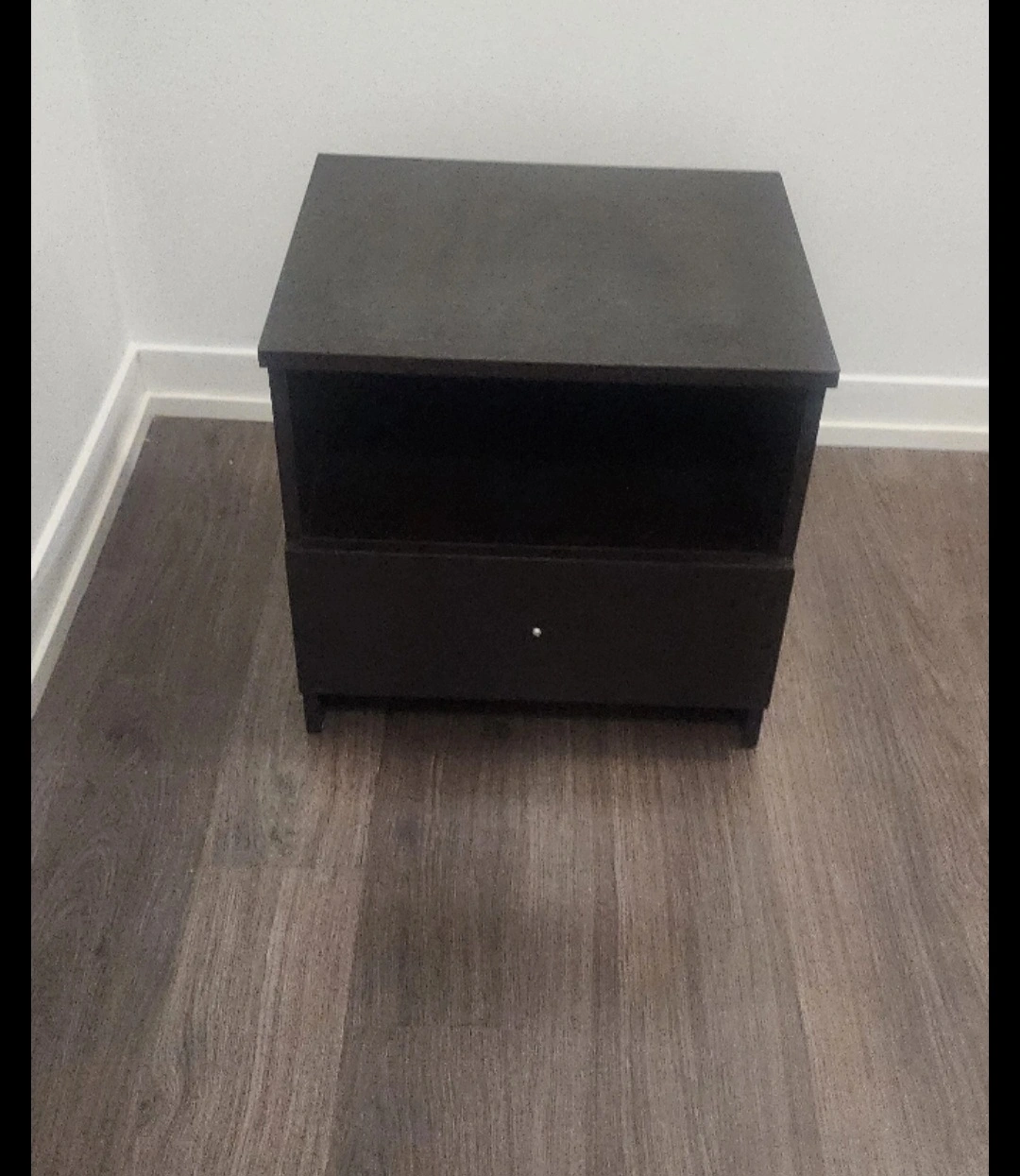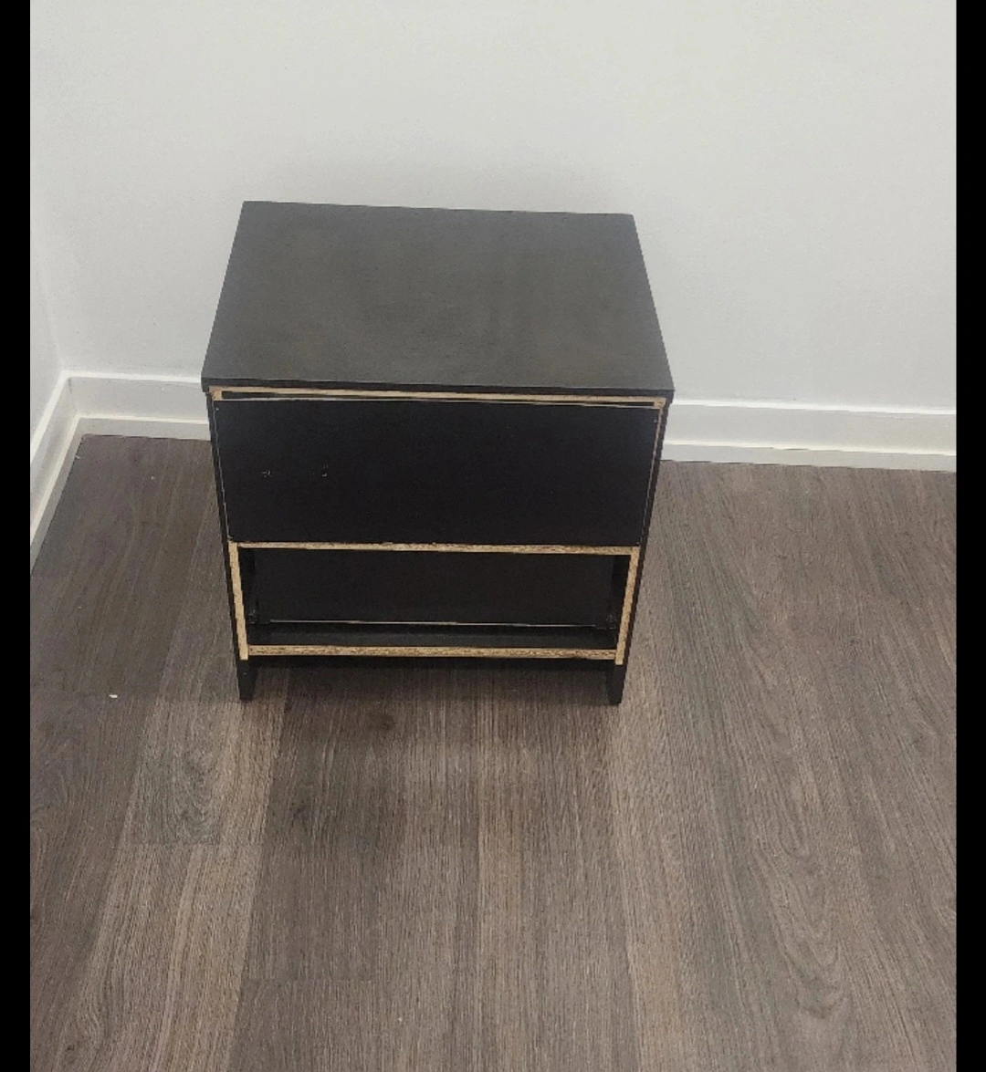 Selling a black nightstand with a drawer. It's in good condition and perfect for adding some storage next to your bed. The nightstand measures approximately 21 inches in height.