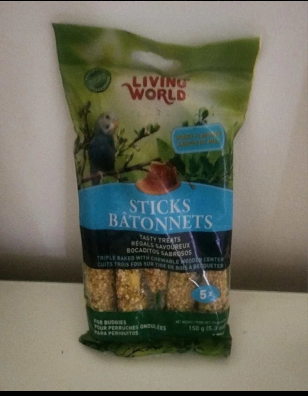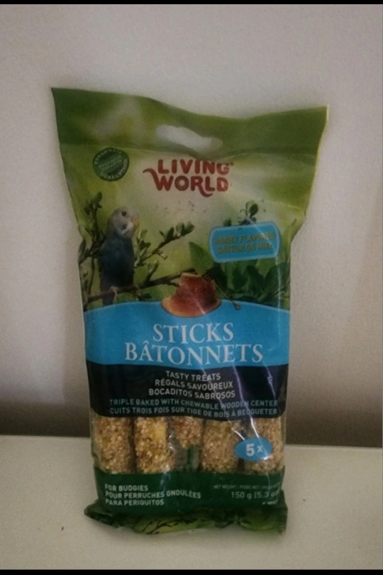 Selling a pack of Living World Sticks Batonnet treats for your feathered friends! These tasty treats are triple baked with a chewable wooden center, making them a fun and delicious snack for parakeets and other small birds