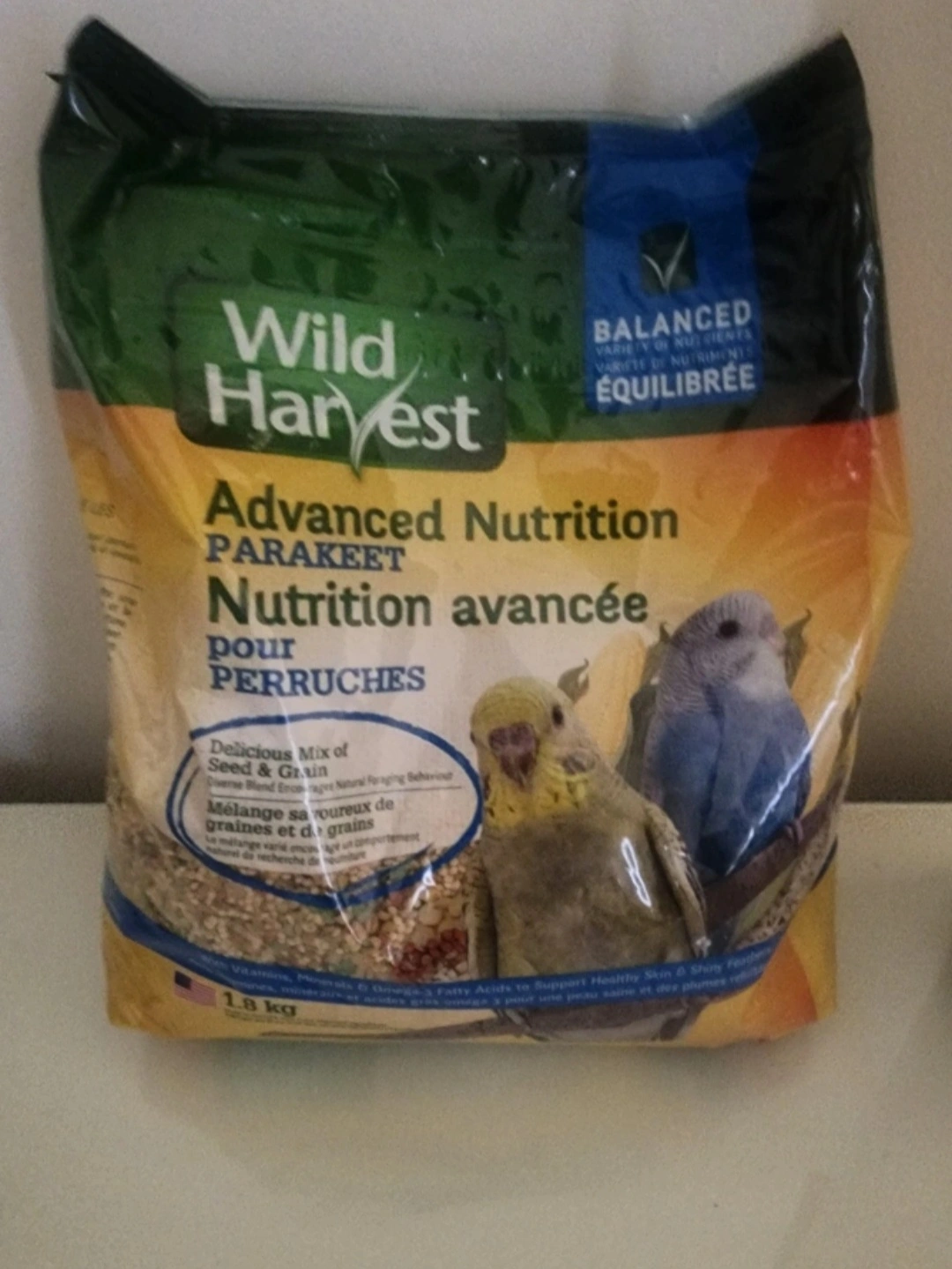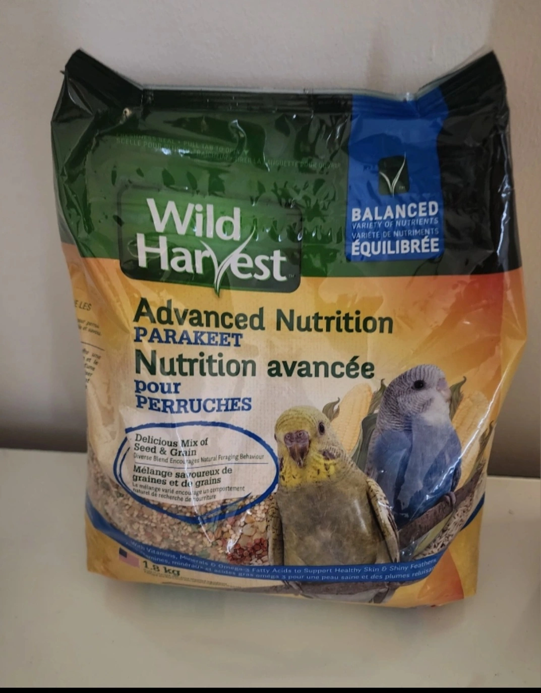 Selling a bag of Wild Harvest Advanced Nutrition Parakeet food. It's a delicious mix of seed and grain, perfect for your feathered friends. This balanced variety of nutrients supports healthy skin and shiny feathers. It comes in a 1.8 kg bag