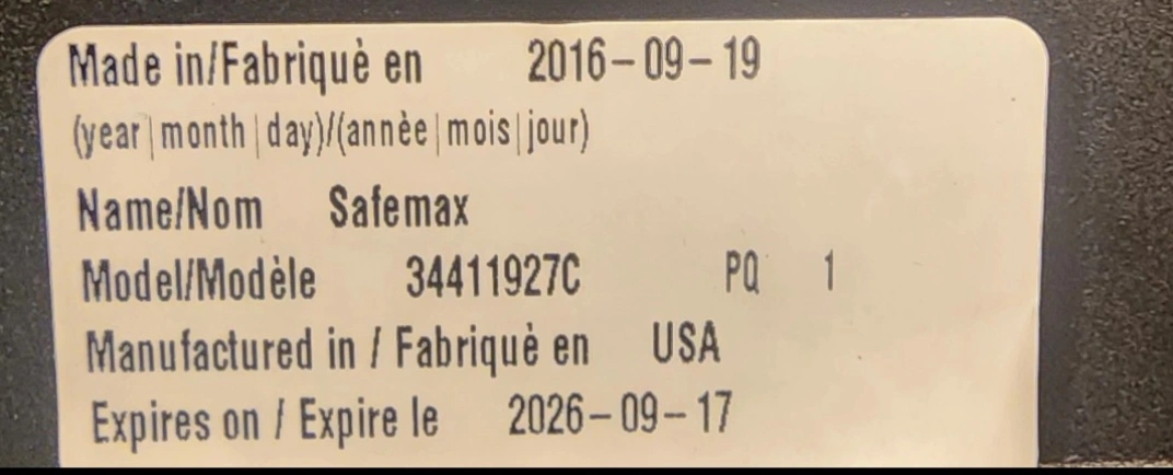 Selling an Evenflo Safemax car seat. The model number is 34411927C. It was manufactured in 2016 September 19 and expires on 2026 September 17.