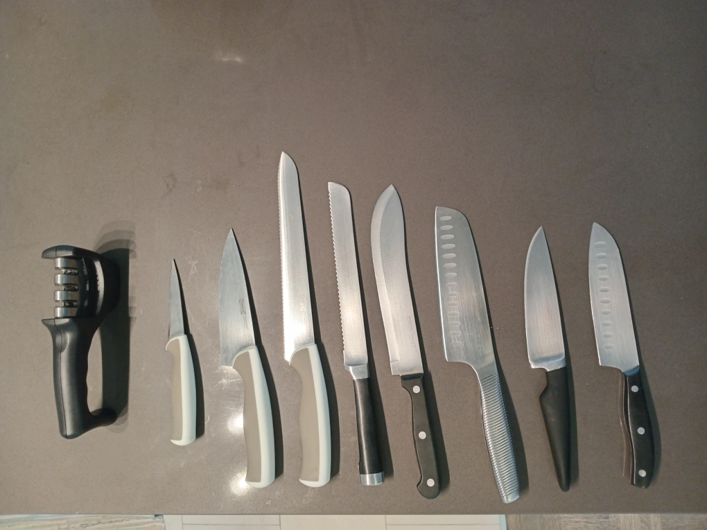 Selling a set of knives that includes a knife sharpener. They are in good condition and ready for a new home!