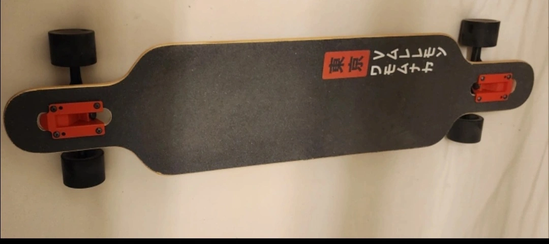 Selling a longboard skateboard with a cool tiger design. It features a black deck with a vibrant tiger graphic and Japanese lettering. The wheels and trucks are in great shape, ready for cruising around town