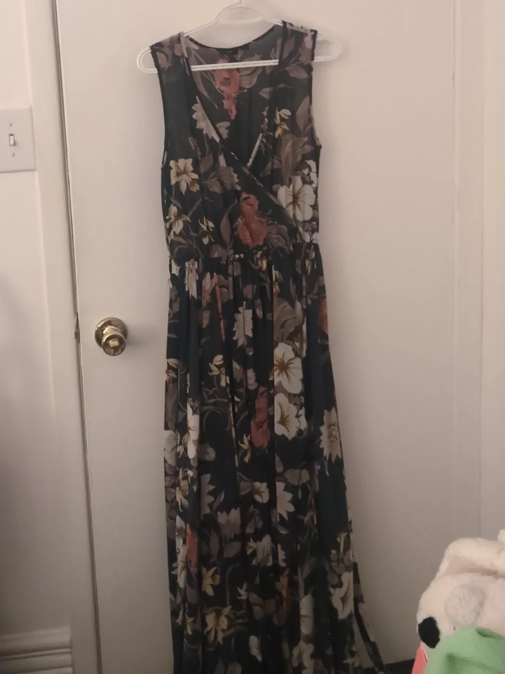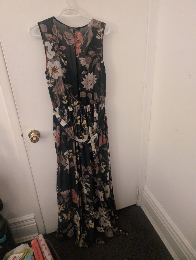Selling a lovely floral maxi dress! It's perfect for a summer day or a special occasion. The dress features a flattering V-neck and a comfortable elastic waistband. It has a beautiful floral pattern in shades of black, brown, and white. It’s in great condition and ready for a new home
