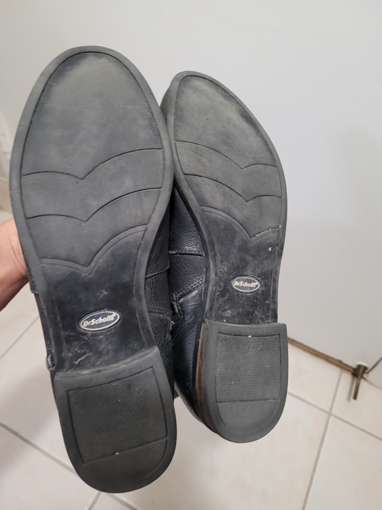 They show some signs of wear, as you can see in the photos, but they still have lots of life left in them! The soles are marked with the Dr. Scholl's logo.