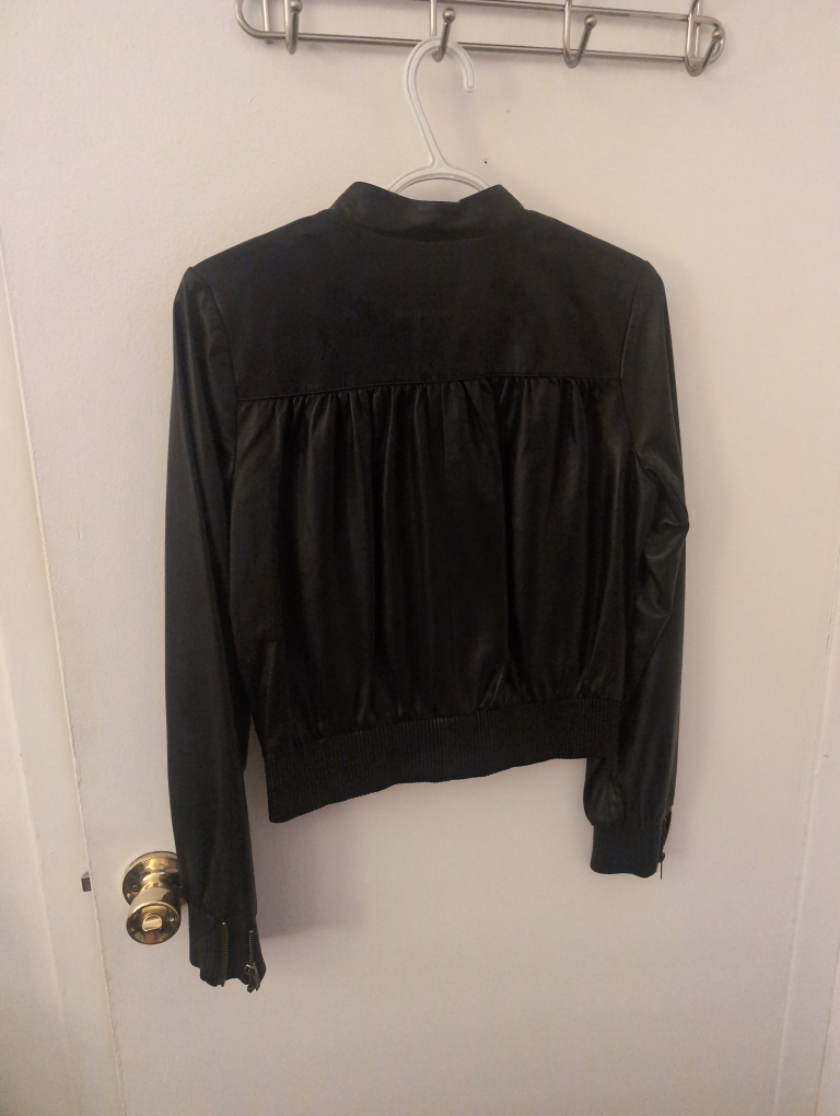 I'm selling a stylish Jimmy Choo black leather jacket. It's in great condition and ready for a new home! It's a sleek and versatile piece that can be dressed up or down. Perfect for adding a touch of edgy elegance to any outfit