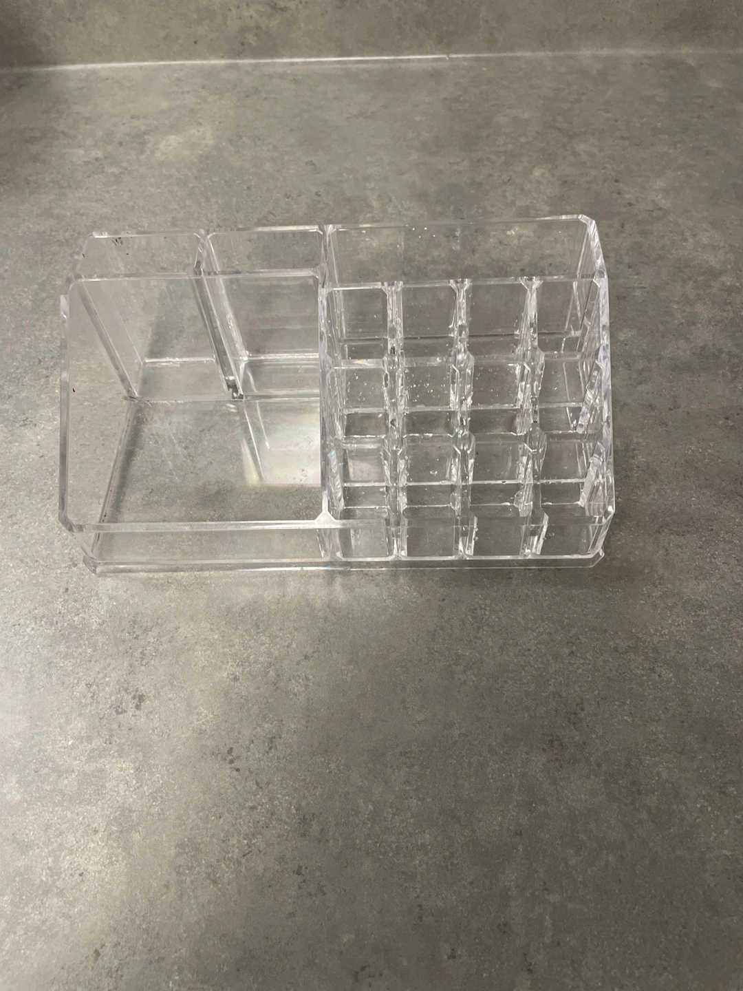 Here's a clear acrylic makeup organizer! It's great for keeping your cosmetics neat and tidy on your vanity or bathroom counter. It features multiple compartments for different sized items like lipsticks, brushes, and palettes