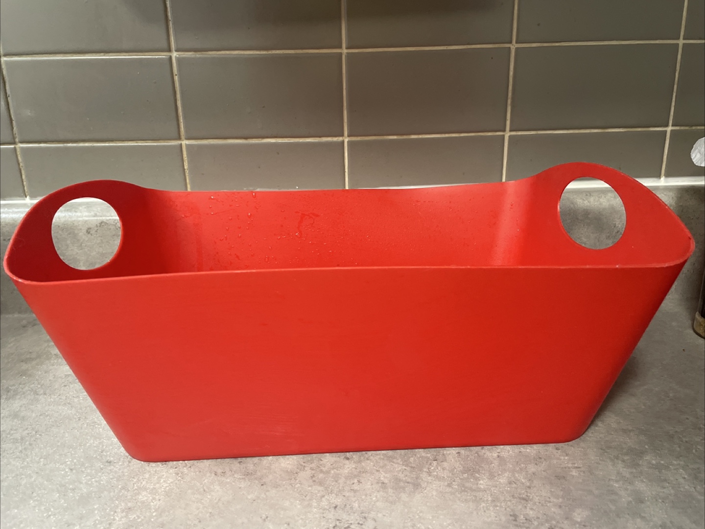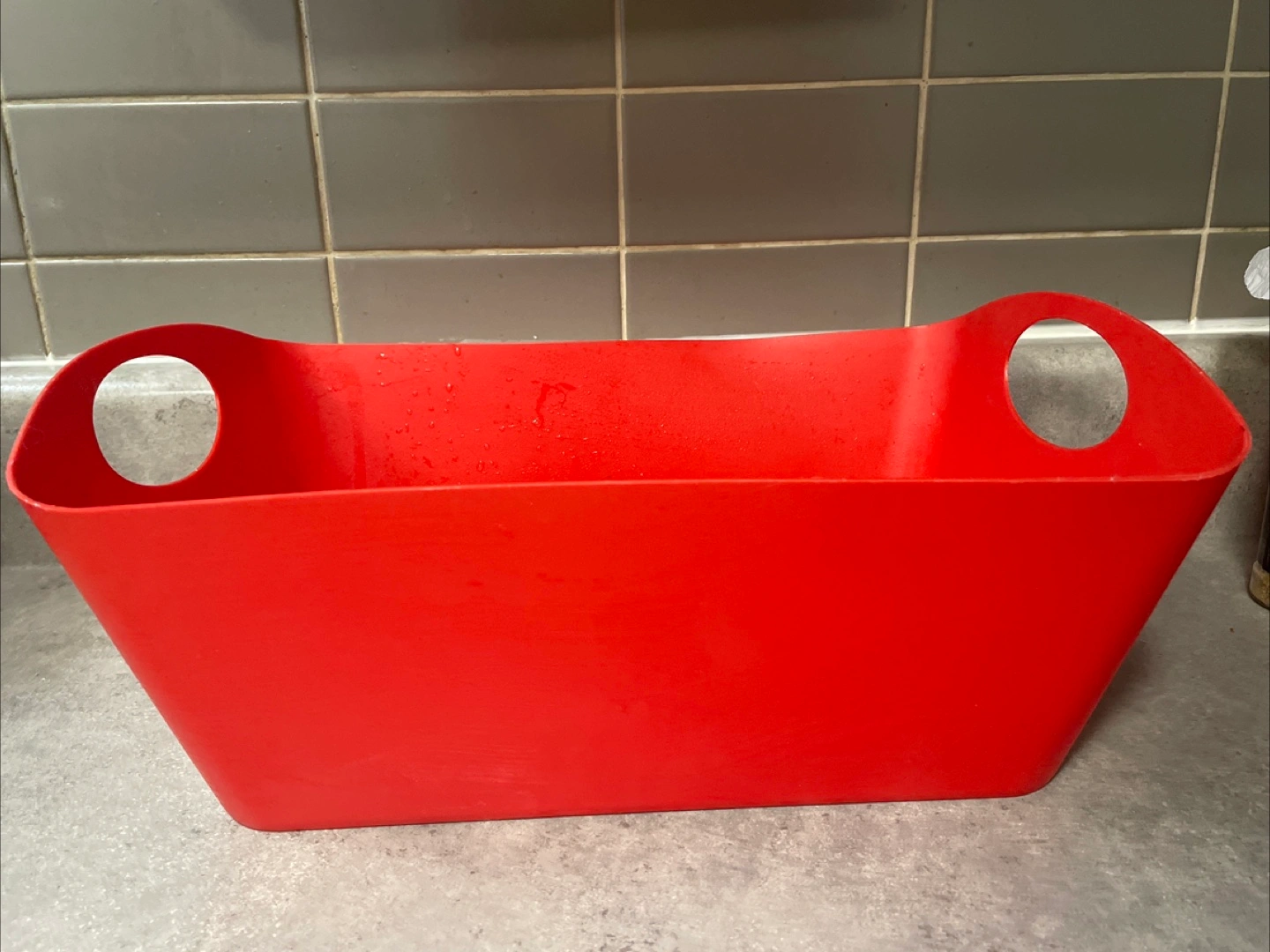 Here's a handy red plastic storage bin! It's perfect for organizing items around the house. It's in great shape and ready for a new home🥕