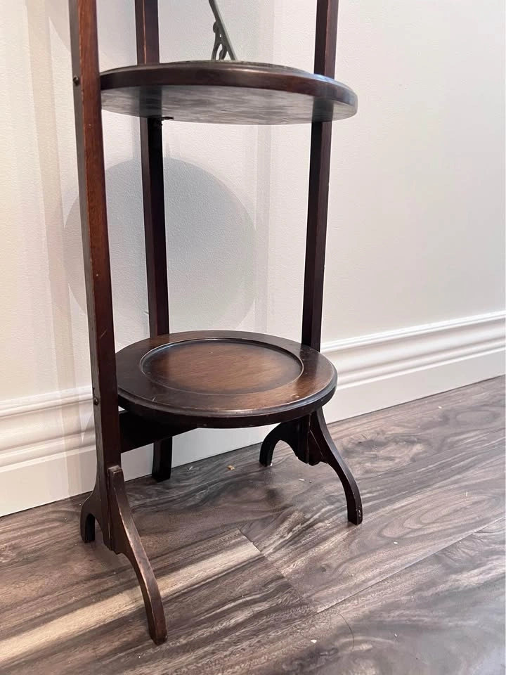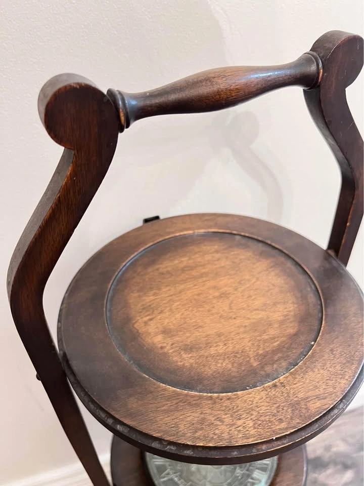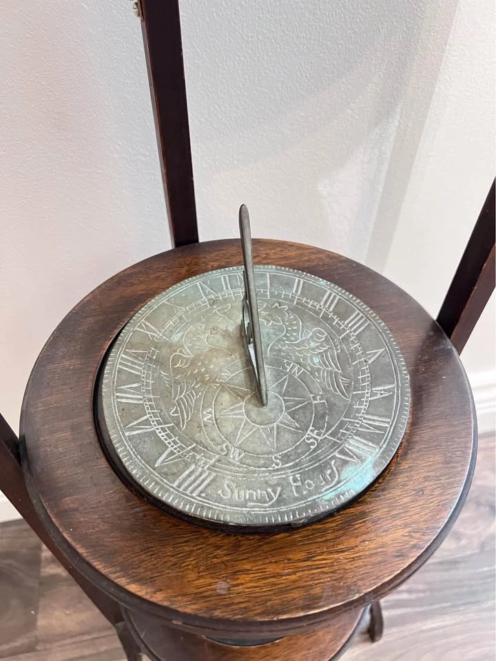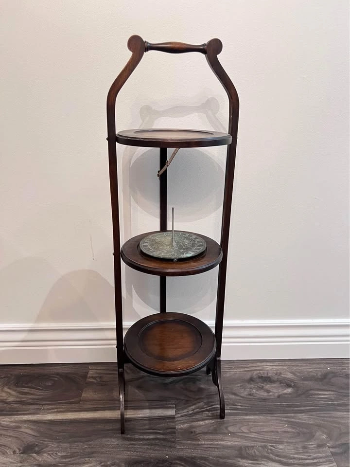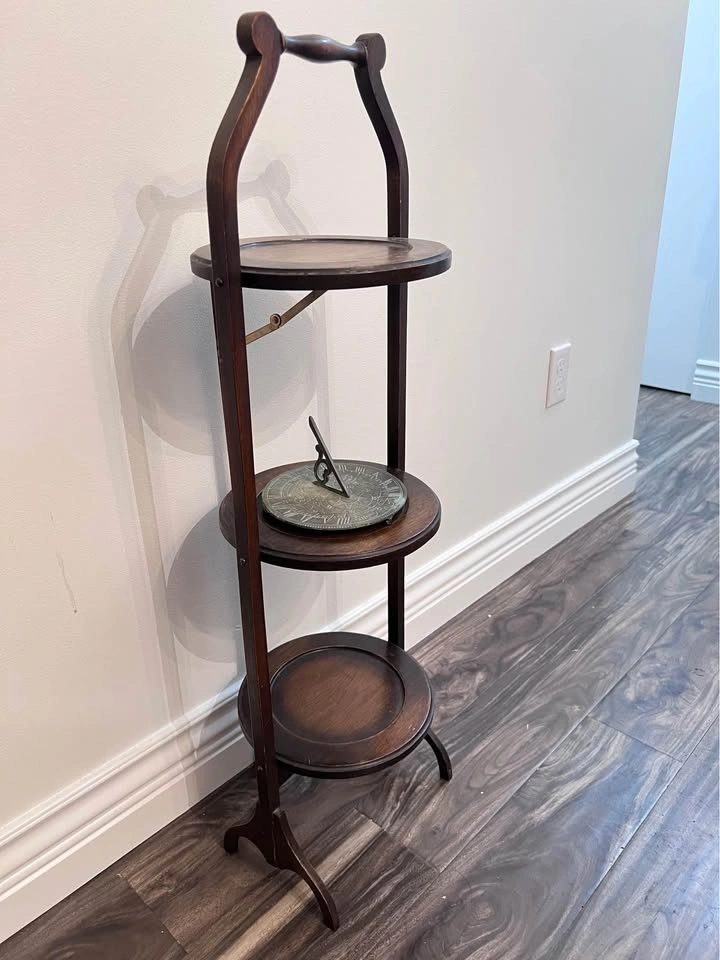 This elegant antique three-tier stand features a beautifully crafted wooden frame and a decorative brass sundial on the middle tier. The top and bottom tiers are solid wood, providing a classic look and functional storage or display space. The stand’s design combines both practical use and historical charm, making it a unique addition to any home decor. Good, with some signs of wear consistent with age, adding to its vintage appeal. Perfect for displaying small plants, books, or decorative items. The sundial adds a historical and aesthetic value to the piece. Feel free to message if you have any questions!