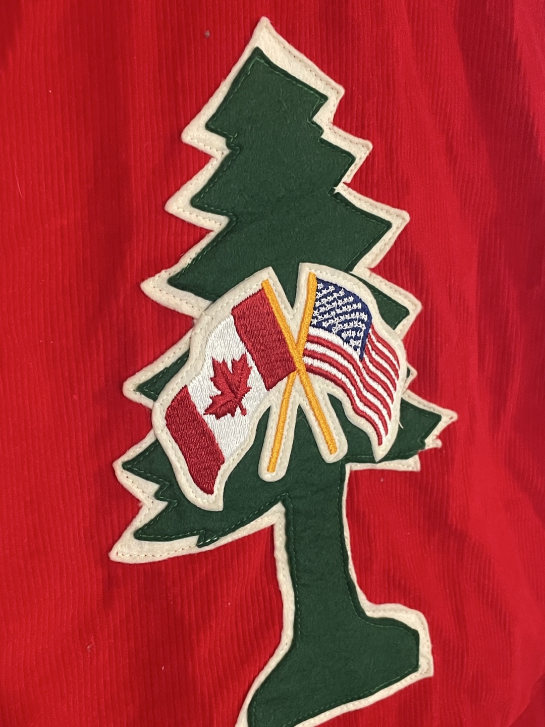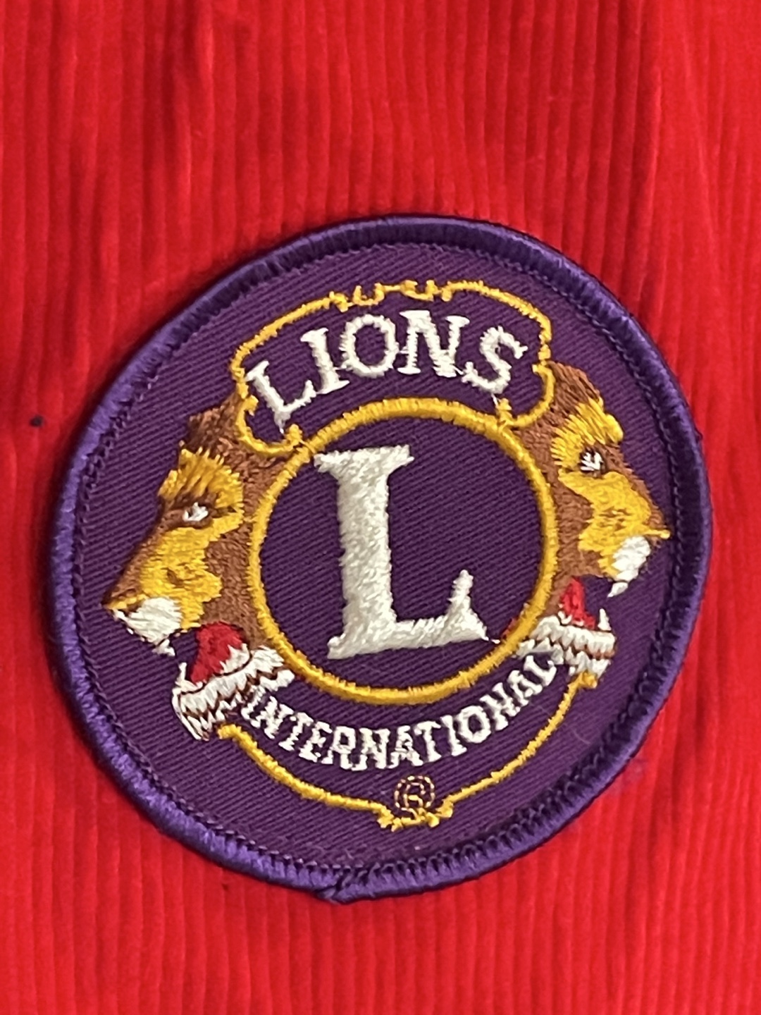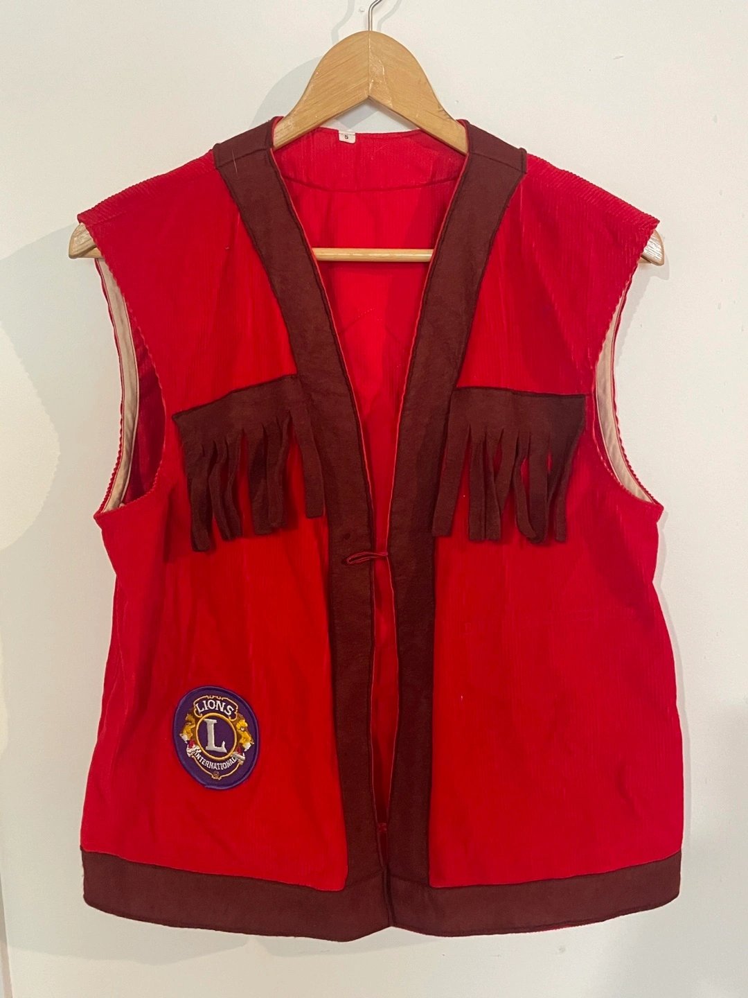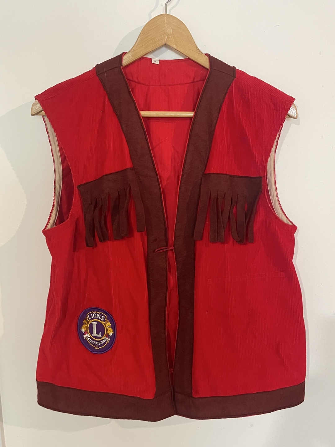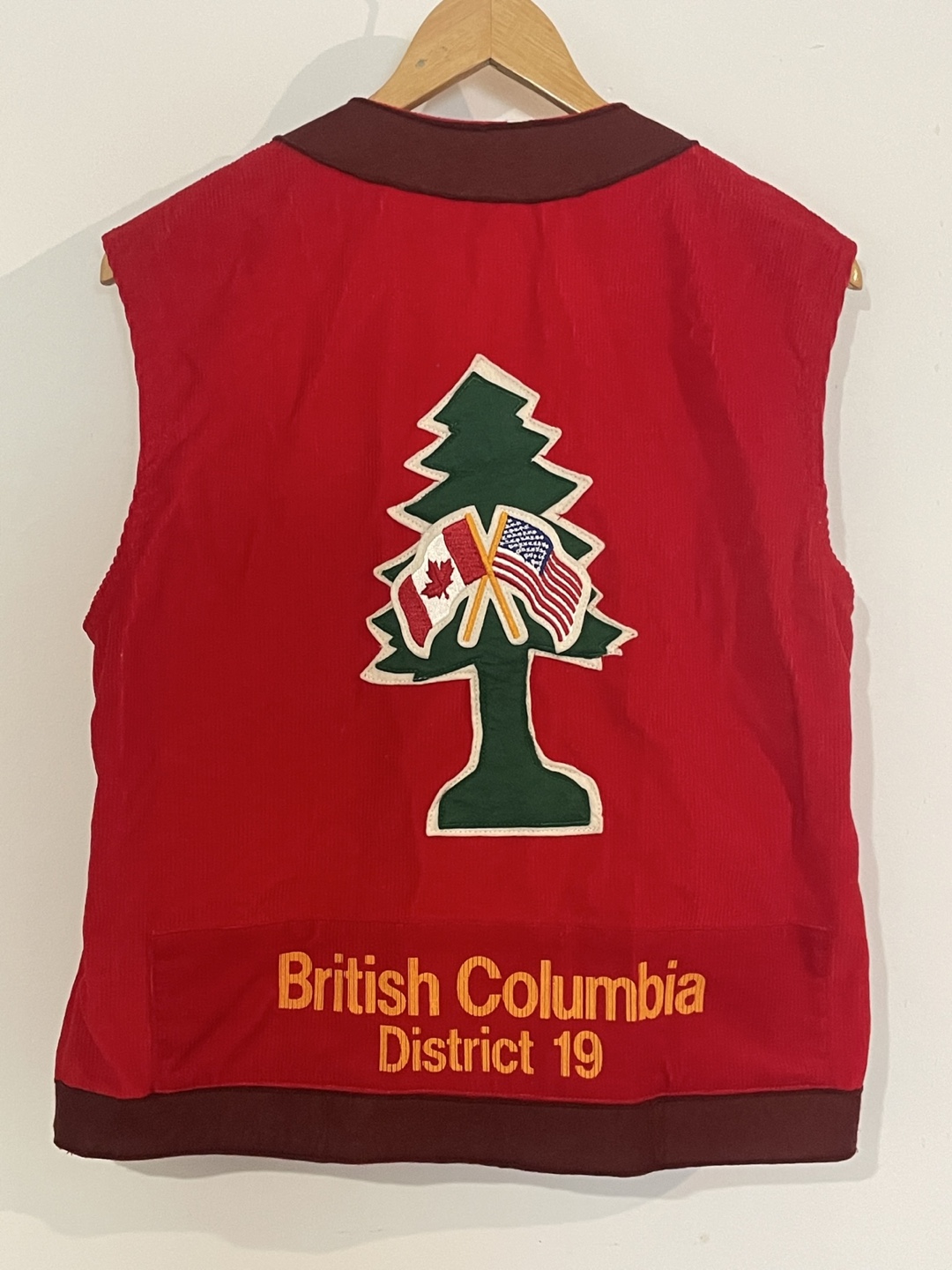Selling a vintage Lions International vest from British Columbia, District 19! It's a unique piece with a red corduroy fabric and distinctive detailing. The back features a tree design with Canadian and American flags. It's a size small.
