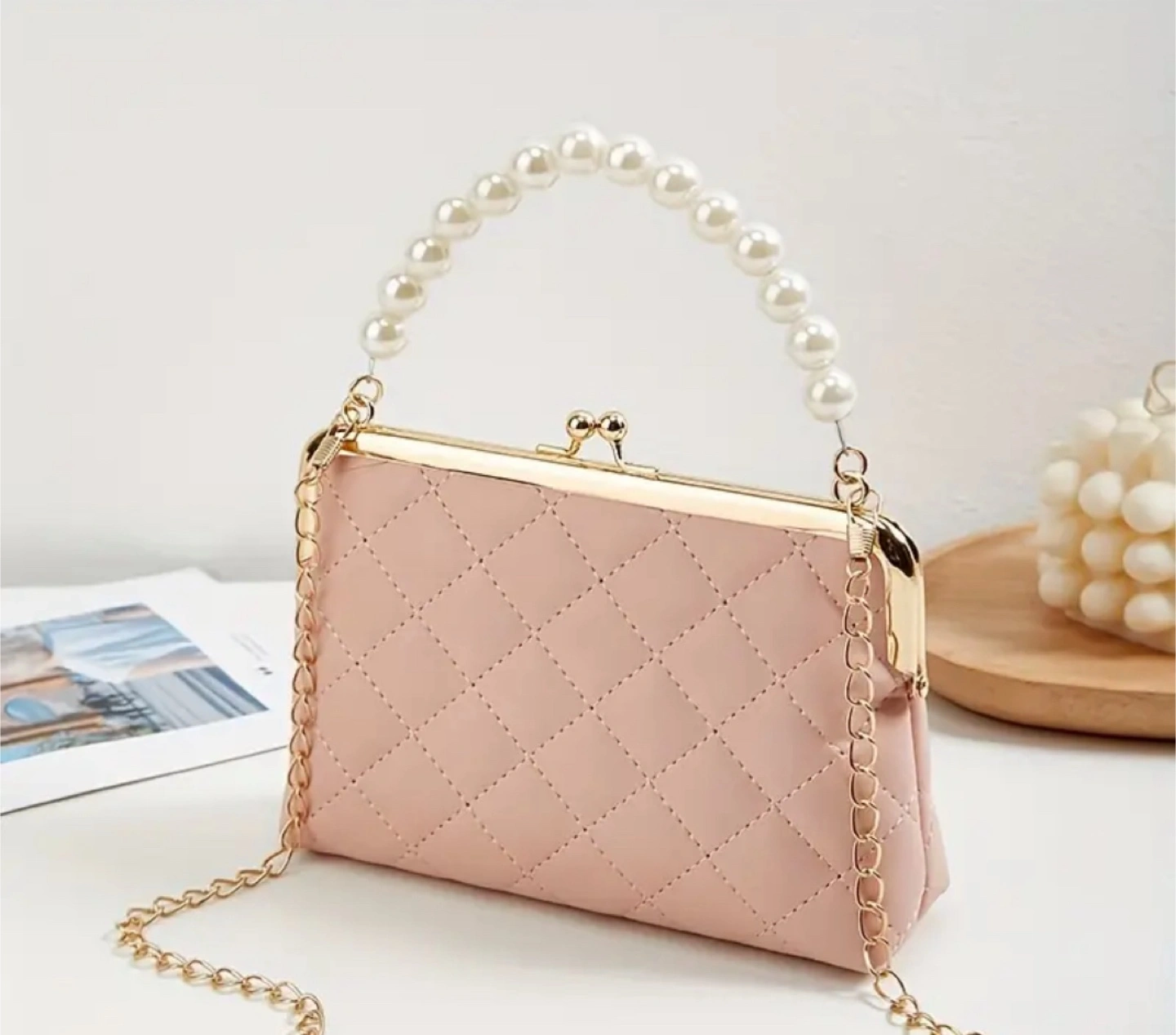 Check out this adorable pink quilted top handle bag! It features a unique kiss lock closure and a stylish pearl-beaded handle. The gold-tone chain adds a touch of elegance. Perfect for adding a chic touch to any outfit! The pearls have discolouration and peeled off, but it came like this and it’s completely brand new.