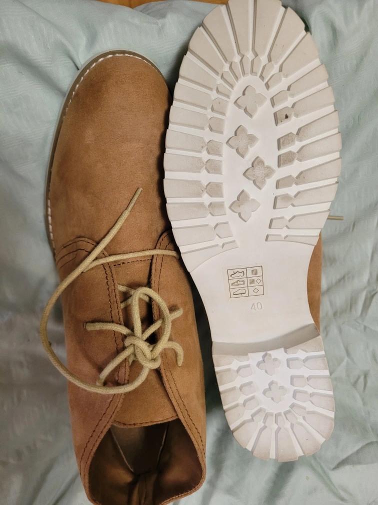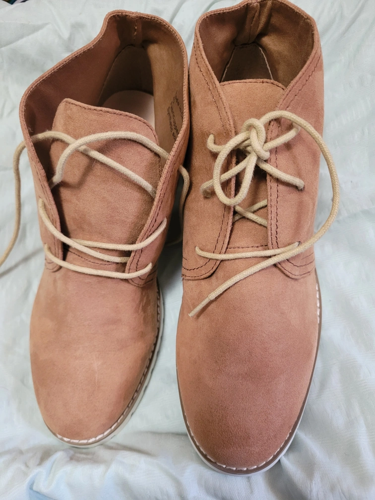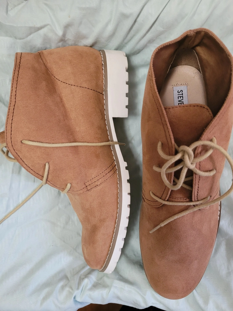 These are a pair of Steve Madden ankle suede type boots in a tan colour. They are a size 40, which is equivalent to a US size 10. They have a lace-up closure and a chunky white sole. Perfect for fall! new never worn