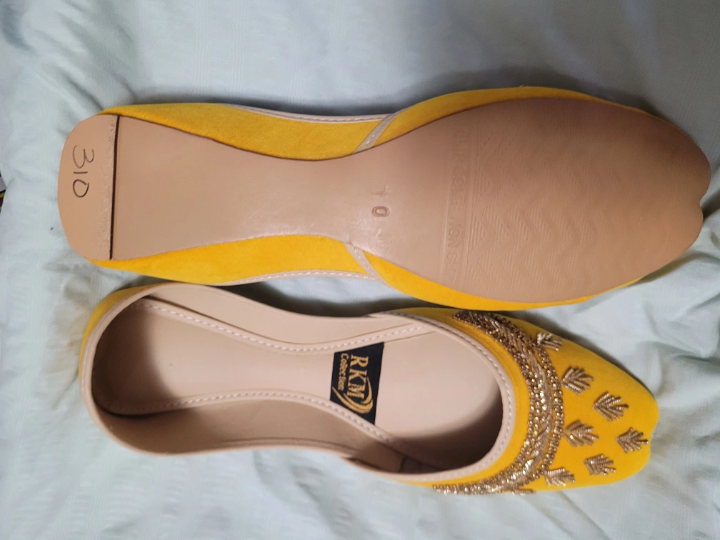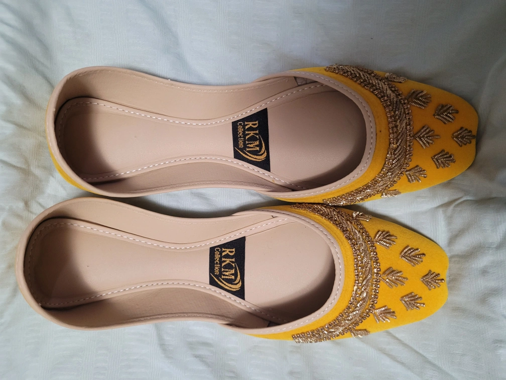 These are a pair of beautiful canary or mustard yellow flats / jutti / khussa. They are size 10 and feature intricate gold embroidery. leather soles. new