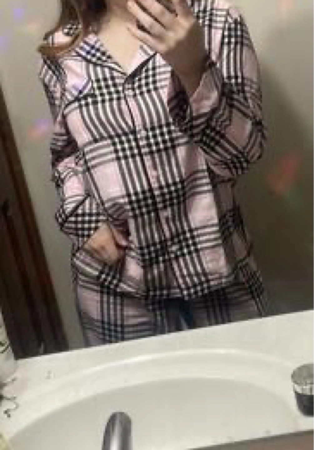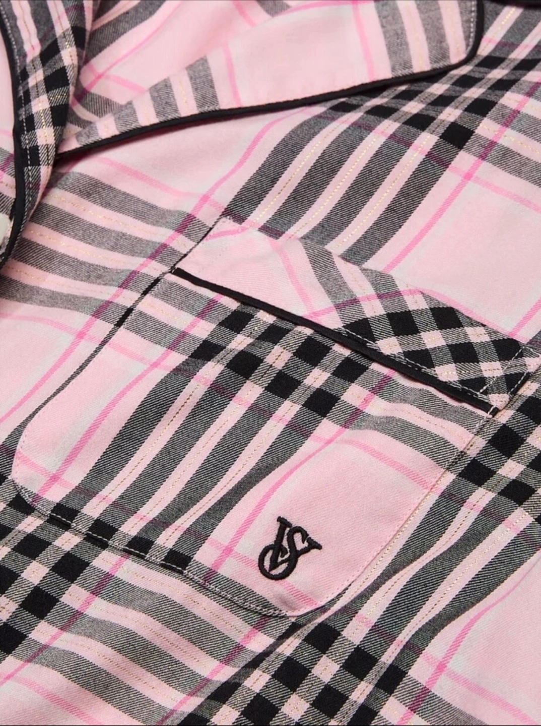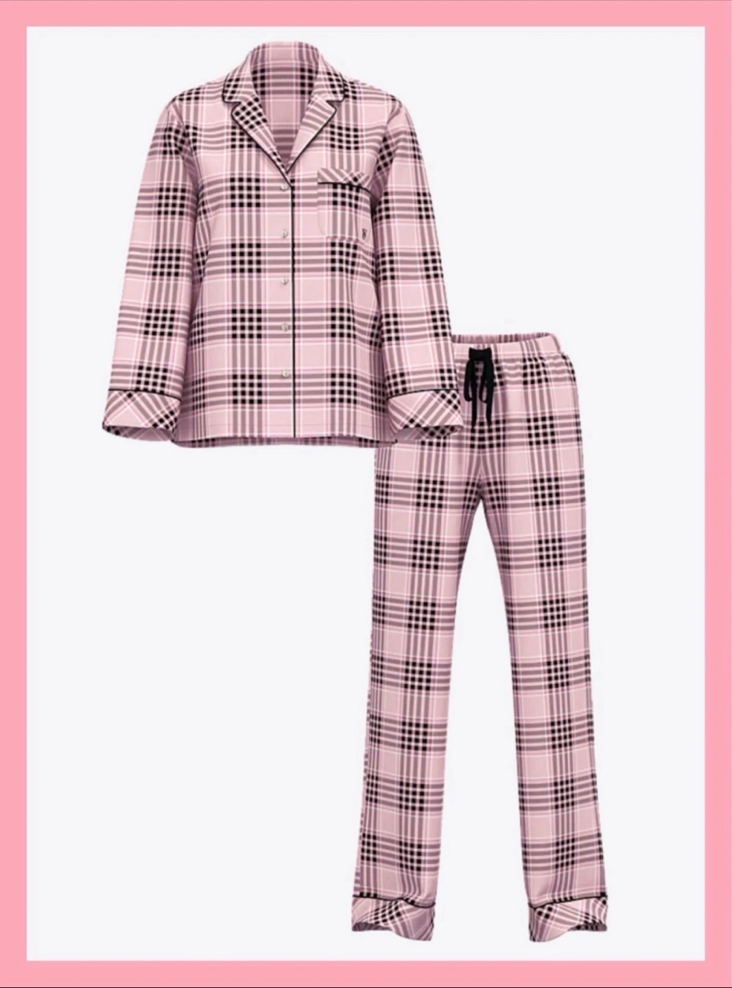 130Victoria's Secret pajama set in a cute pink plaid pattern! The set includes a long-sleeved button-down top and matching pants. Perfect for lounging around the house or a cozy night's sleep