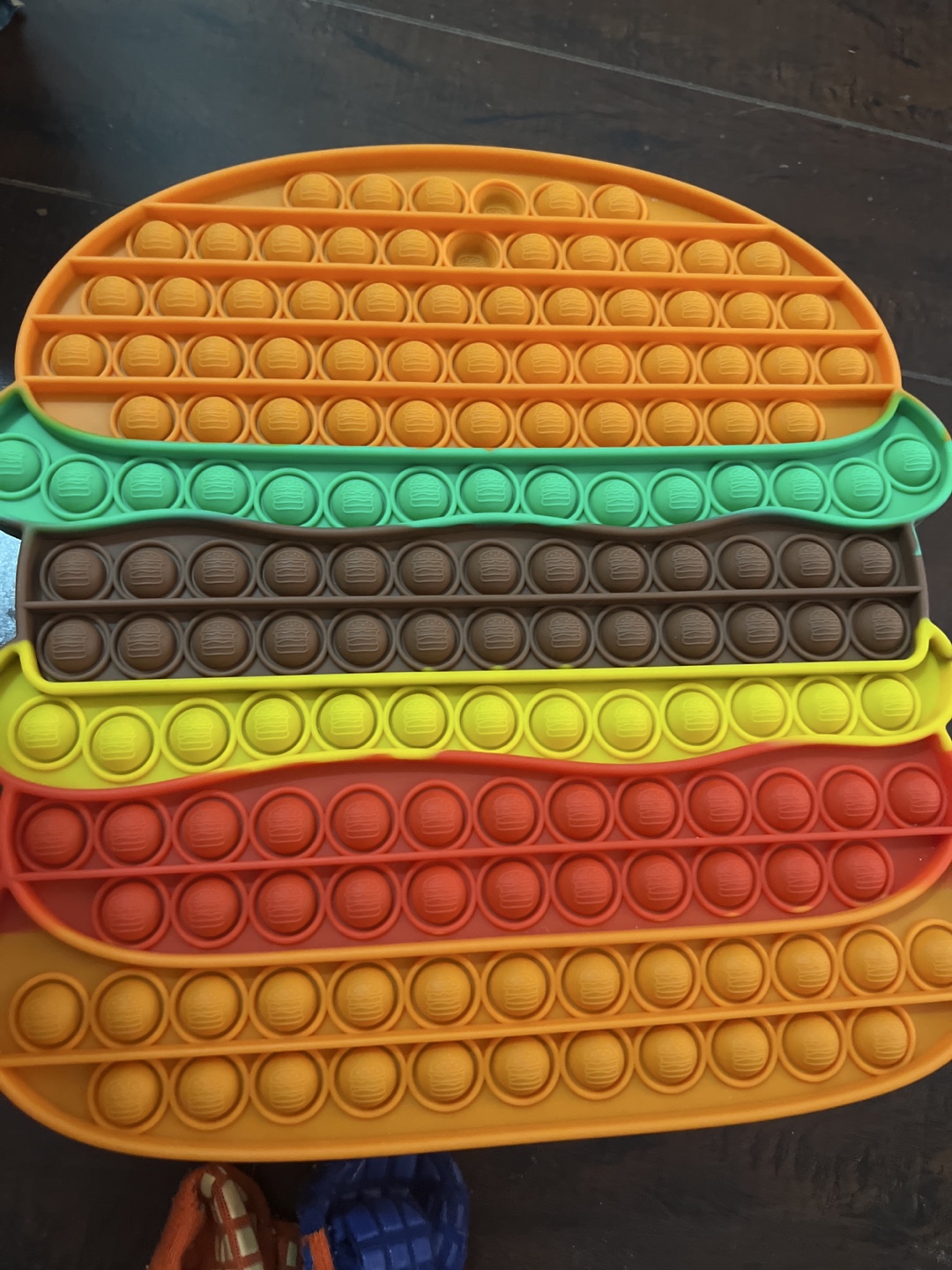 Selling a fun hamburger-shaped Pop It fidget toy! It's in great shape and perfect for keeping little hands busy or relieving stress. The bright colours make it super appealing for kids!