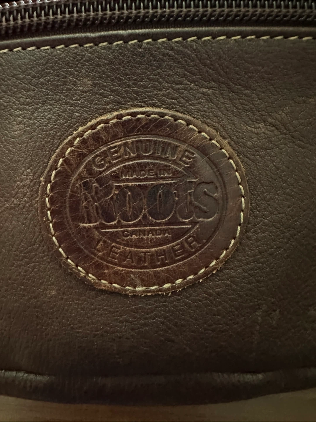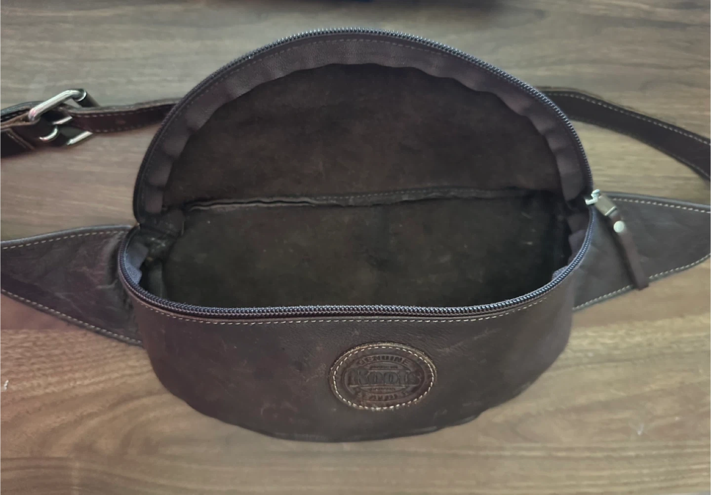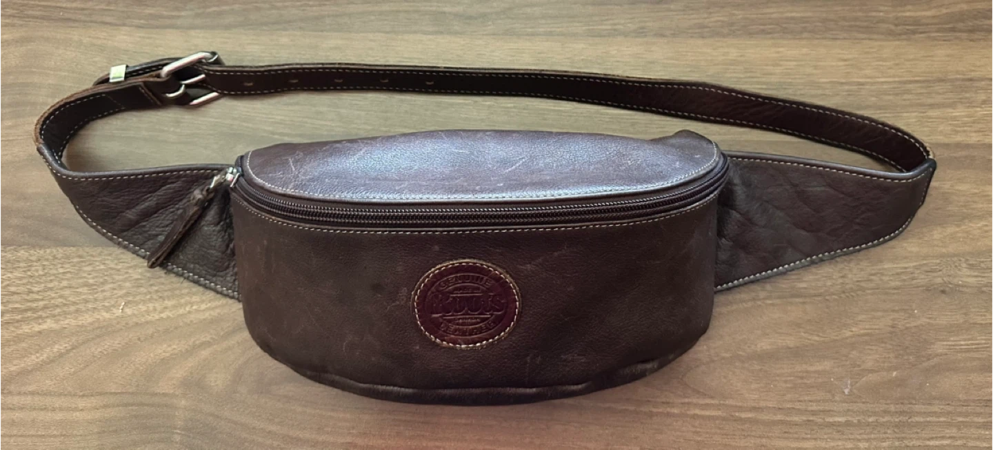 Classic unisex Roots brown leather fanny pack / belt bag.