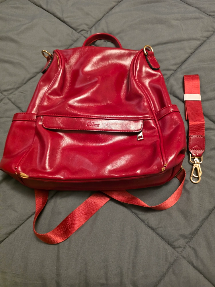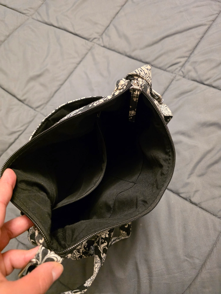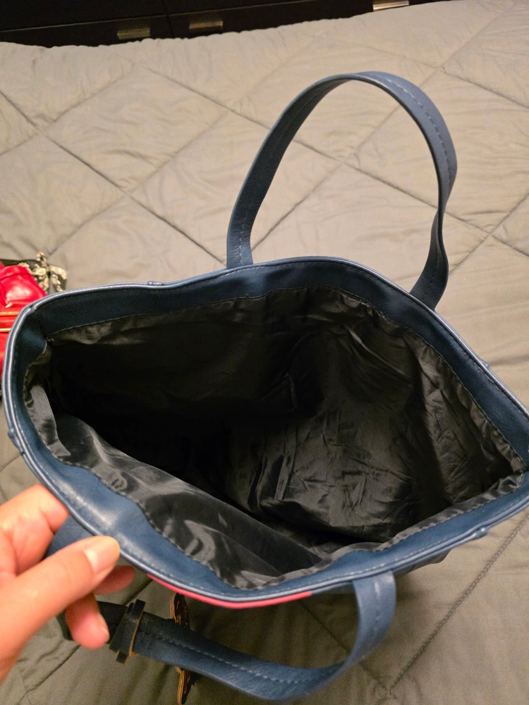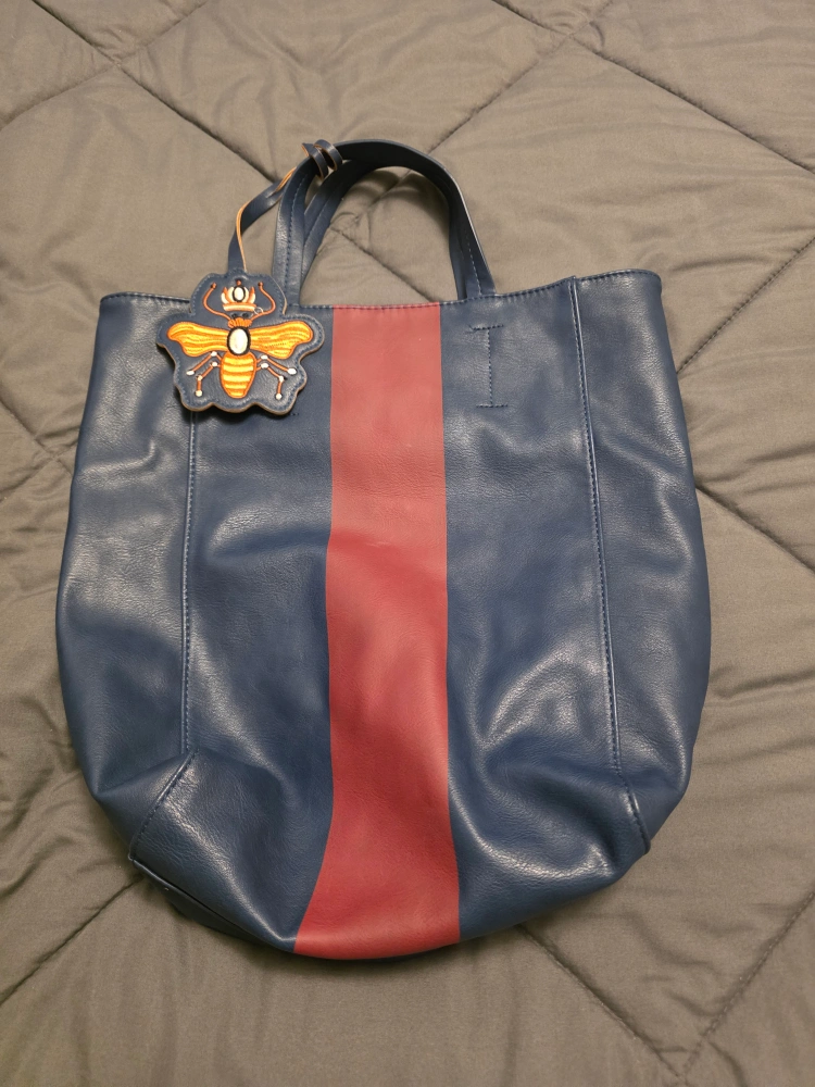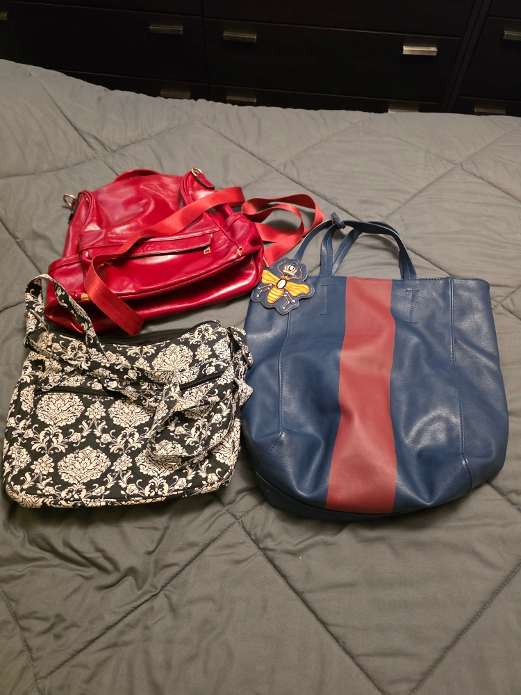 I'm selling a blue tote bag. It has a red stripe down the middle and a cute bee decoration. It would be great for carrying your daily essentials! (no zipper or compartments), the other is a Floral black & white bag with compartments (has a brown spot/stain) and red bag has zipper, compartments and straps (backpack style), has some ware and tear.