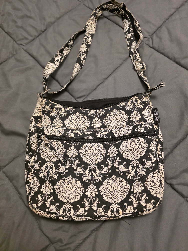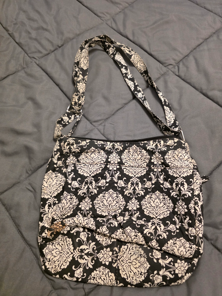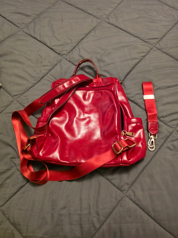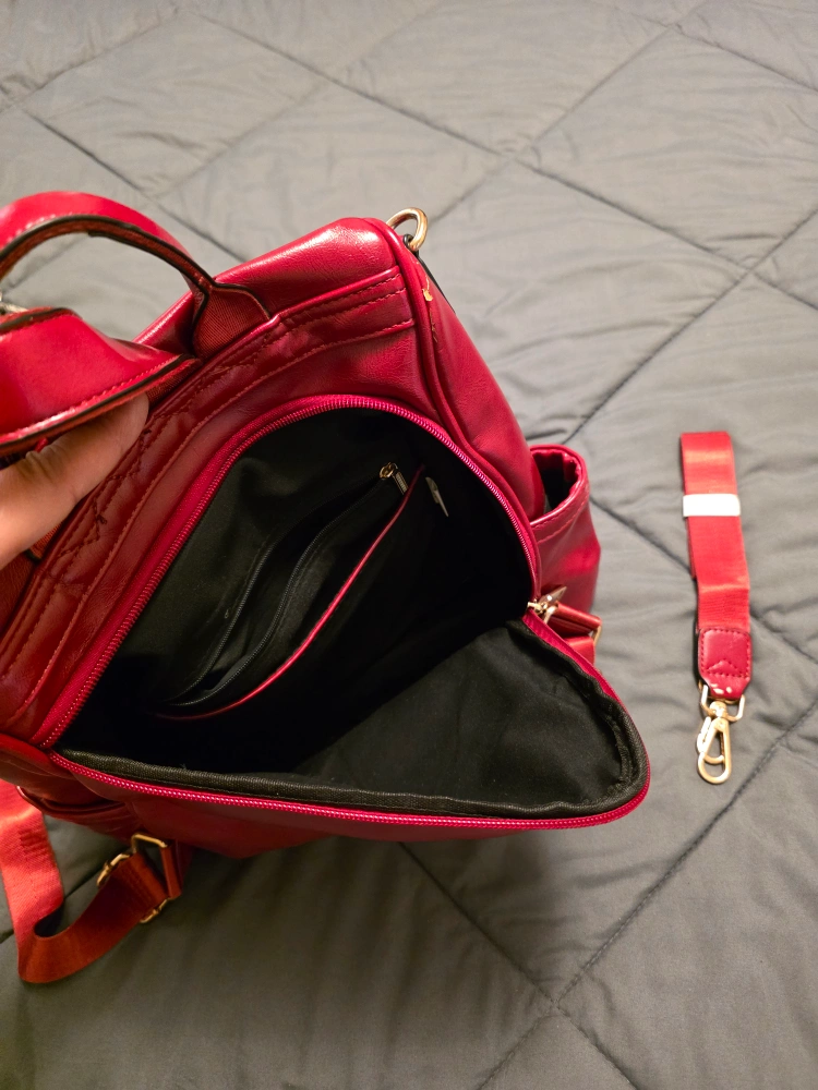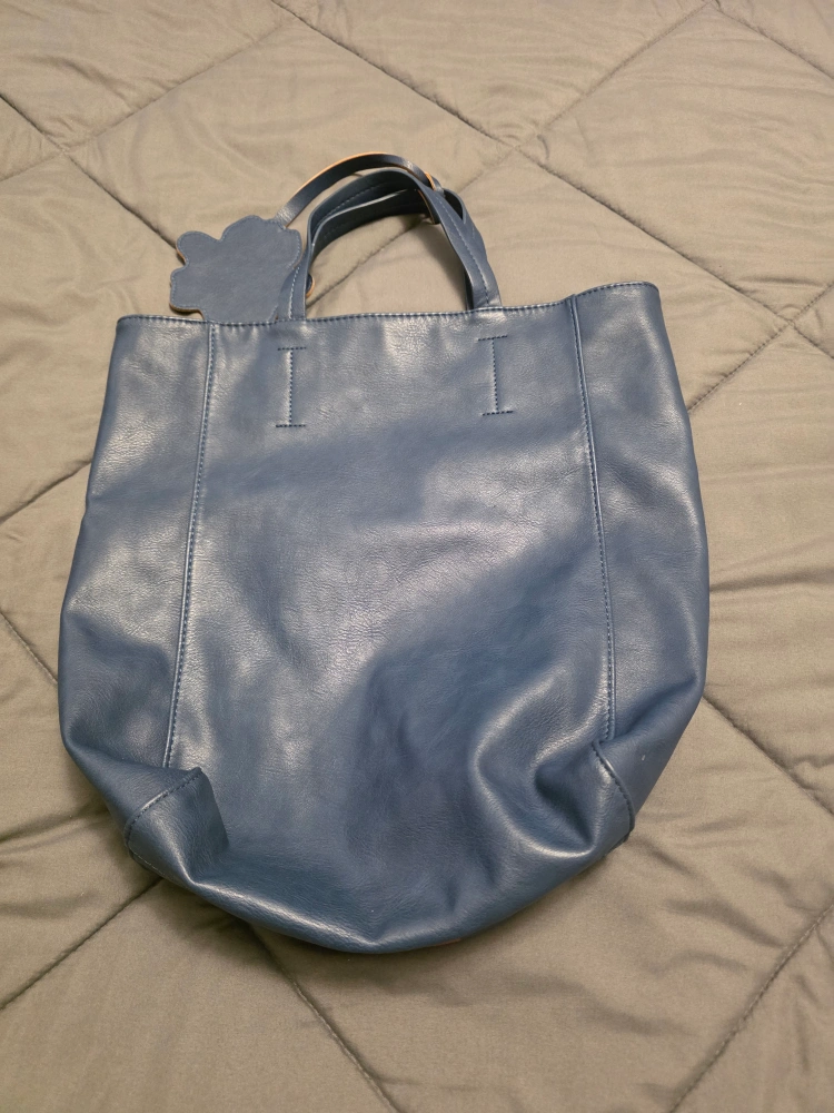 I'm selling a blue tote bag. It has a red stripe down the middle and a cute bee decoration. It would be great for carrying your daily essentials! (no zipper or compartments), the other is a Floral black & white bag with compartments (has a brown spot/stain) and red bag has zipper, compartments and straps (backpack style), has some ware and tear.