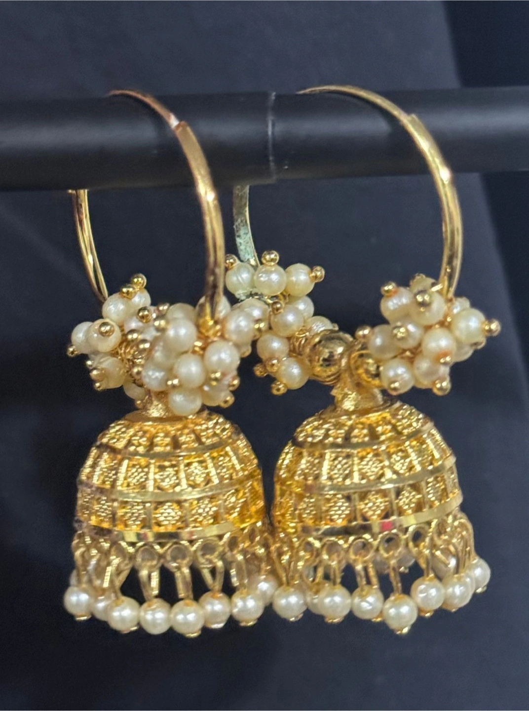 Selling a pair of beautiful gold jhumka earrings adorned with pearls. These earrings are in great condition and would make a lovely addition to any jewelry collection