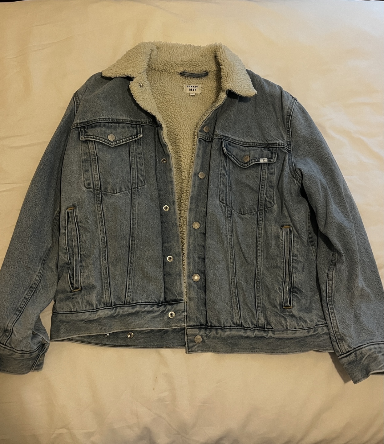 Here's a comfy Sunday Best denim jacket with a sherpa lining! It's a size medium and in great condition. Perfect for adding a bit of warmth and style to your outfit.