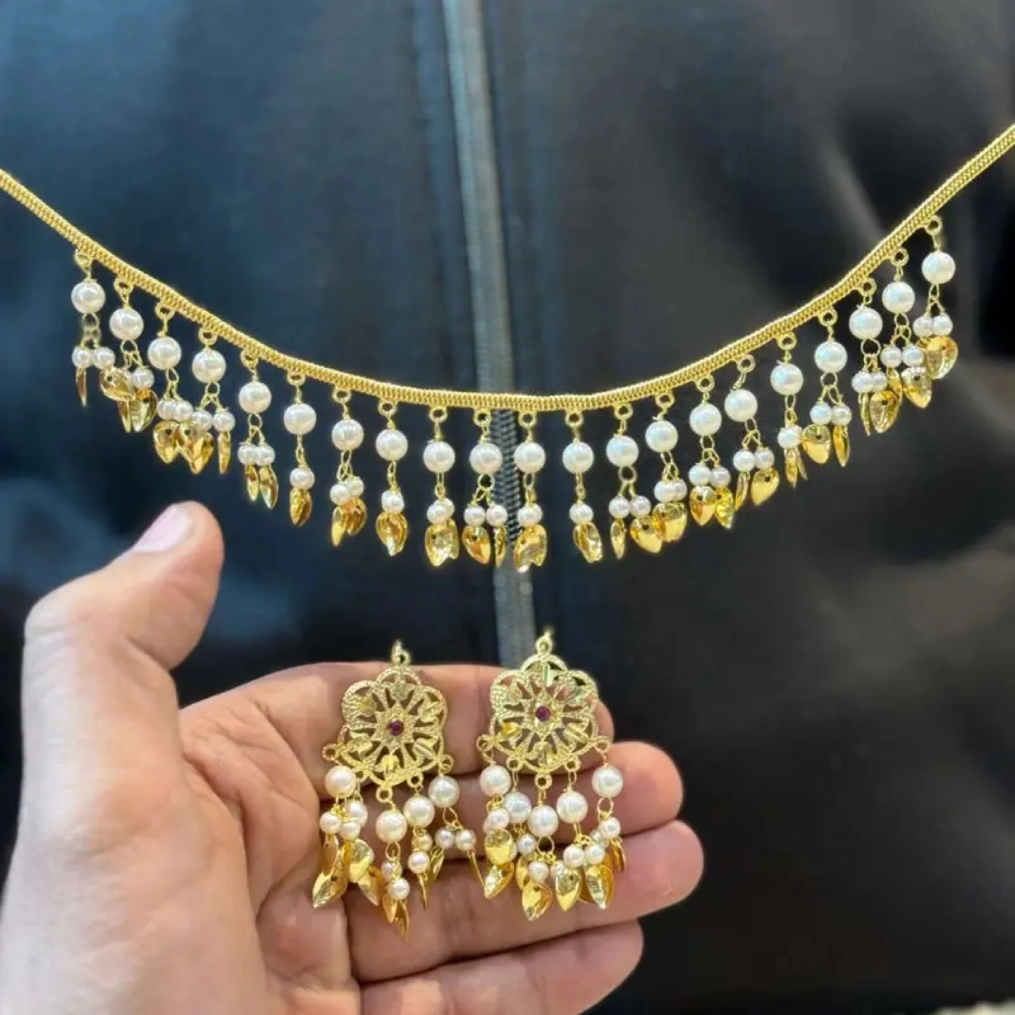 Selling a beautiful gold-plated jewellery set with pearl accents. Includes a necklace and matching earrings. Perfect for adding a touch of elegance to any outfit!
