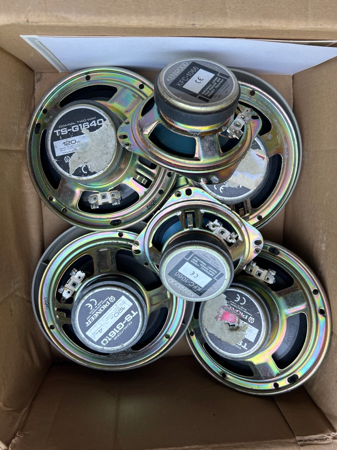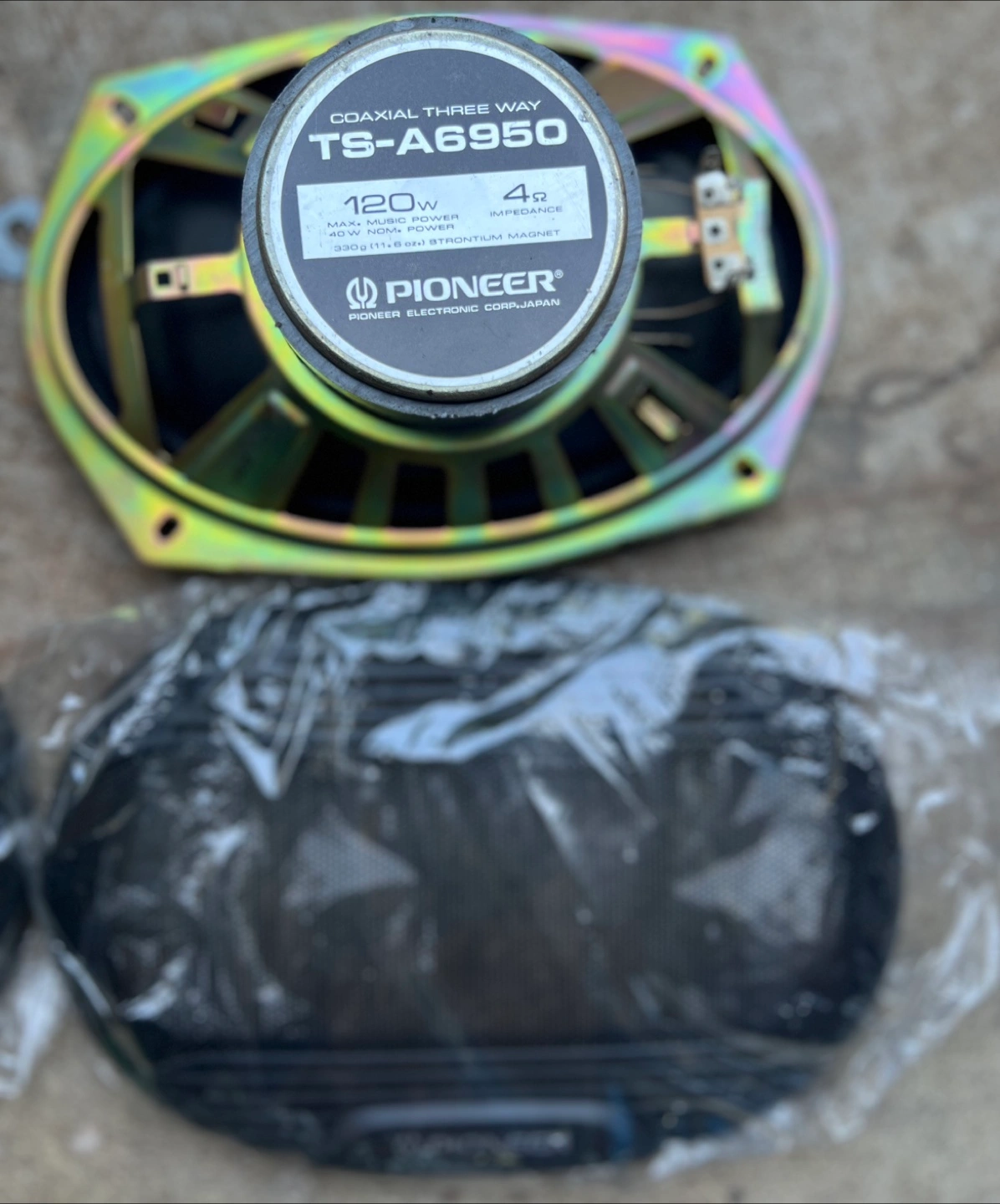 Selling a JVC KS-F130 cassette receiver with a detachable control panel. Also included are Pioneer TS-A6950 coaxial three-way speakers, rated at 120W with 4Ω impedance. Great for adding some vintage sound to your ride!