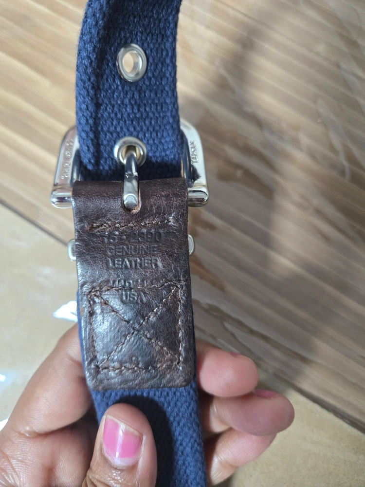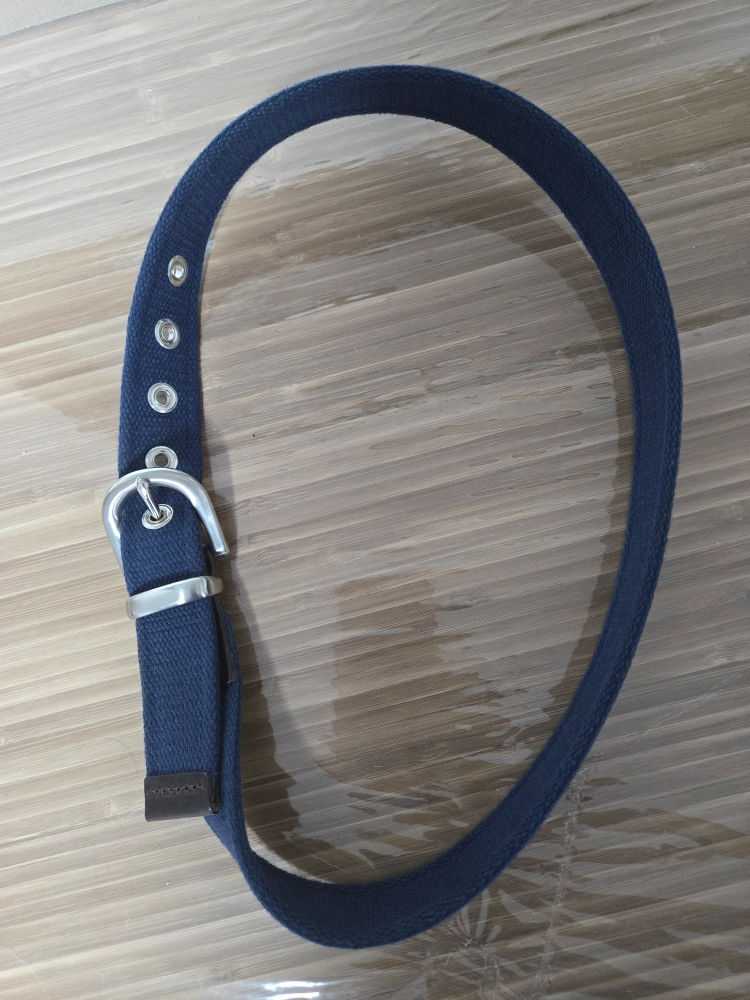 This is a navy blue canvas belt with a silver-toned buckle. It has a leather accent piece. The belt looks to be in great condition!