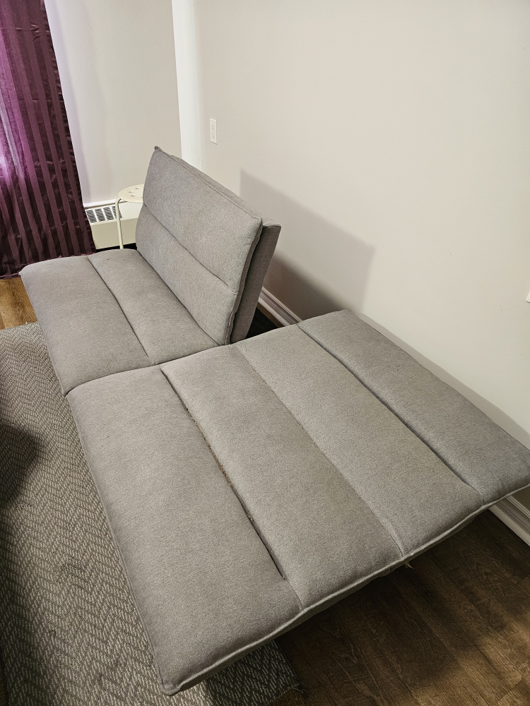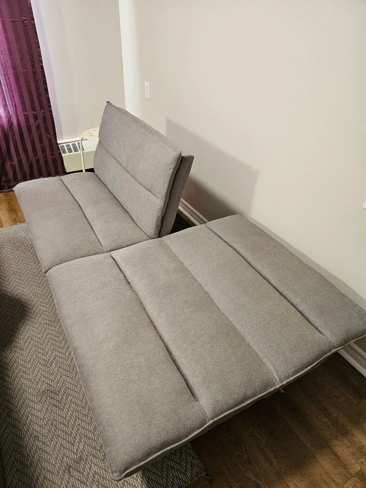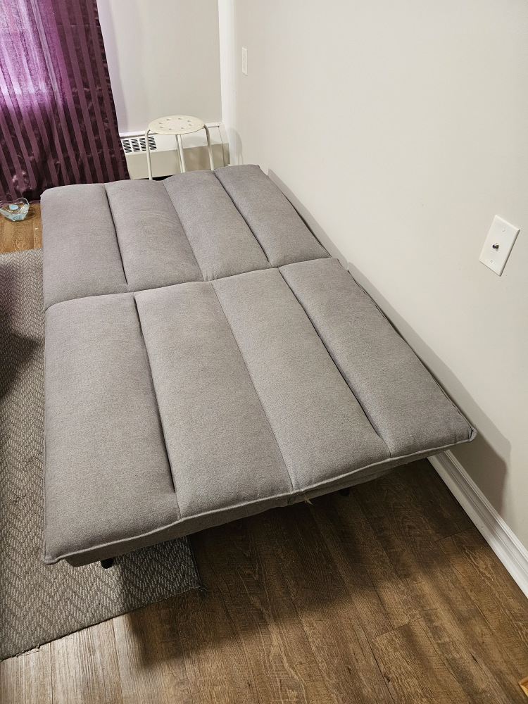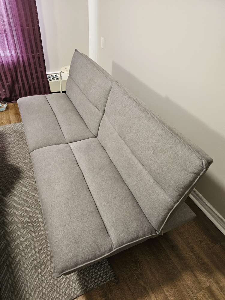 Selling a grey futon that's in great condition! It can be used as a couch or folded down into a bed. Perfect for small spaces or a guest room! It's lightweight and easy to move around too