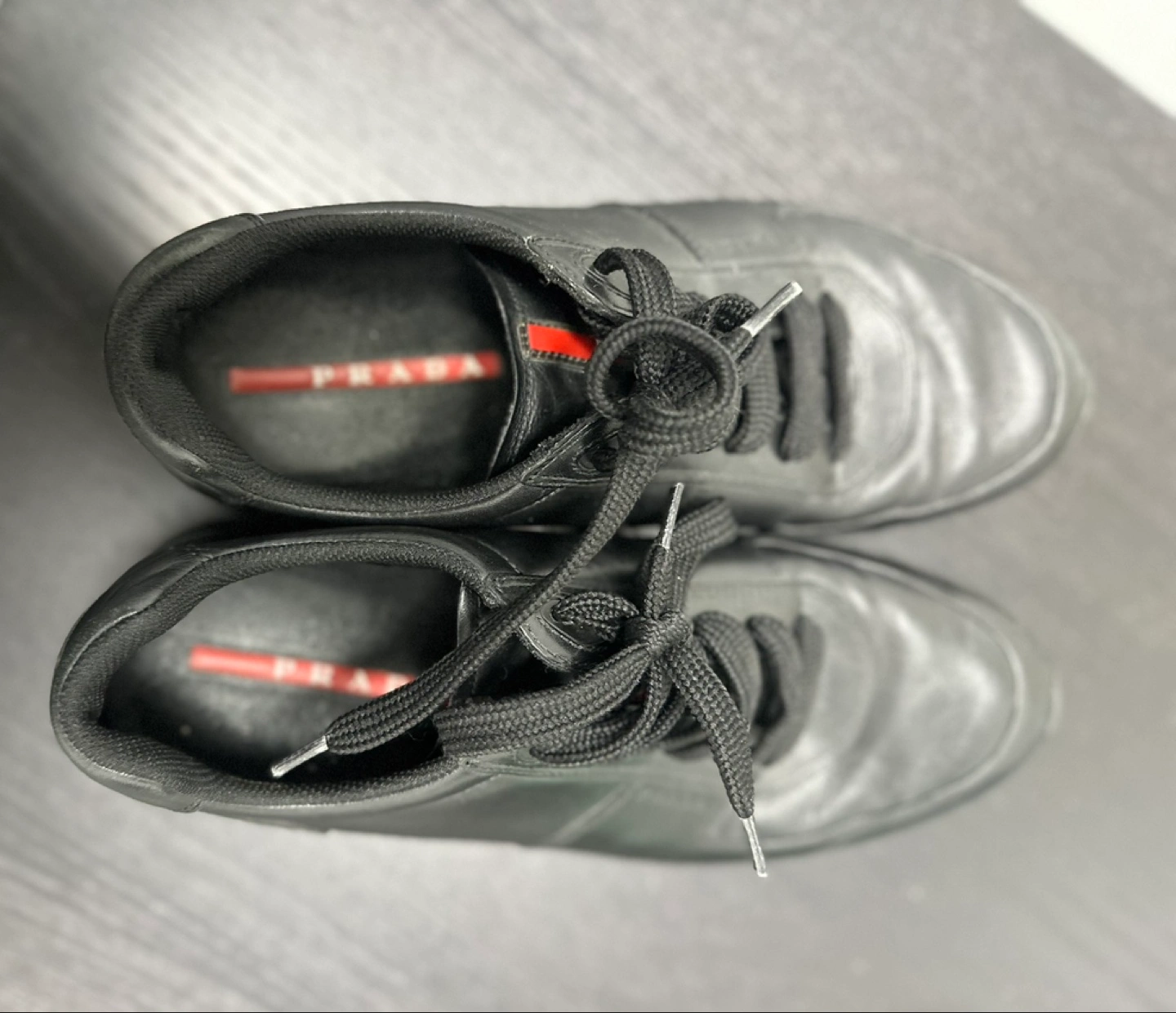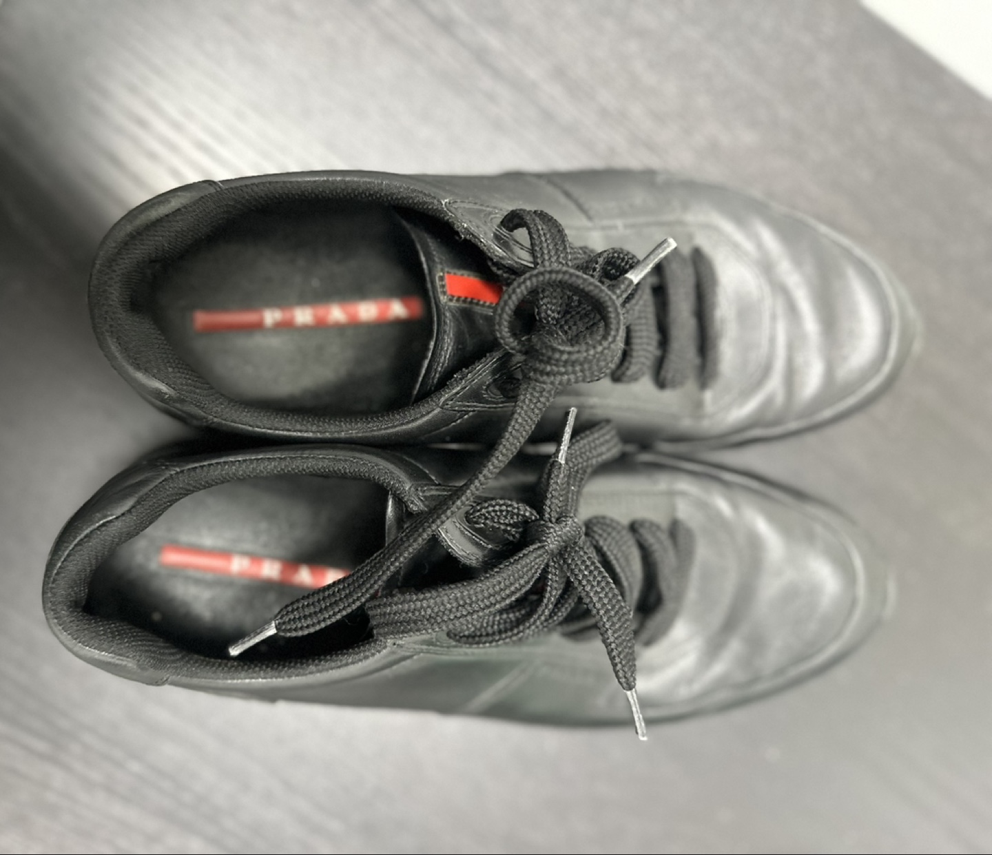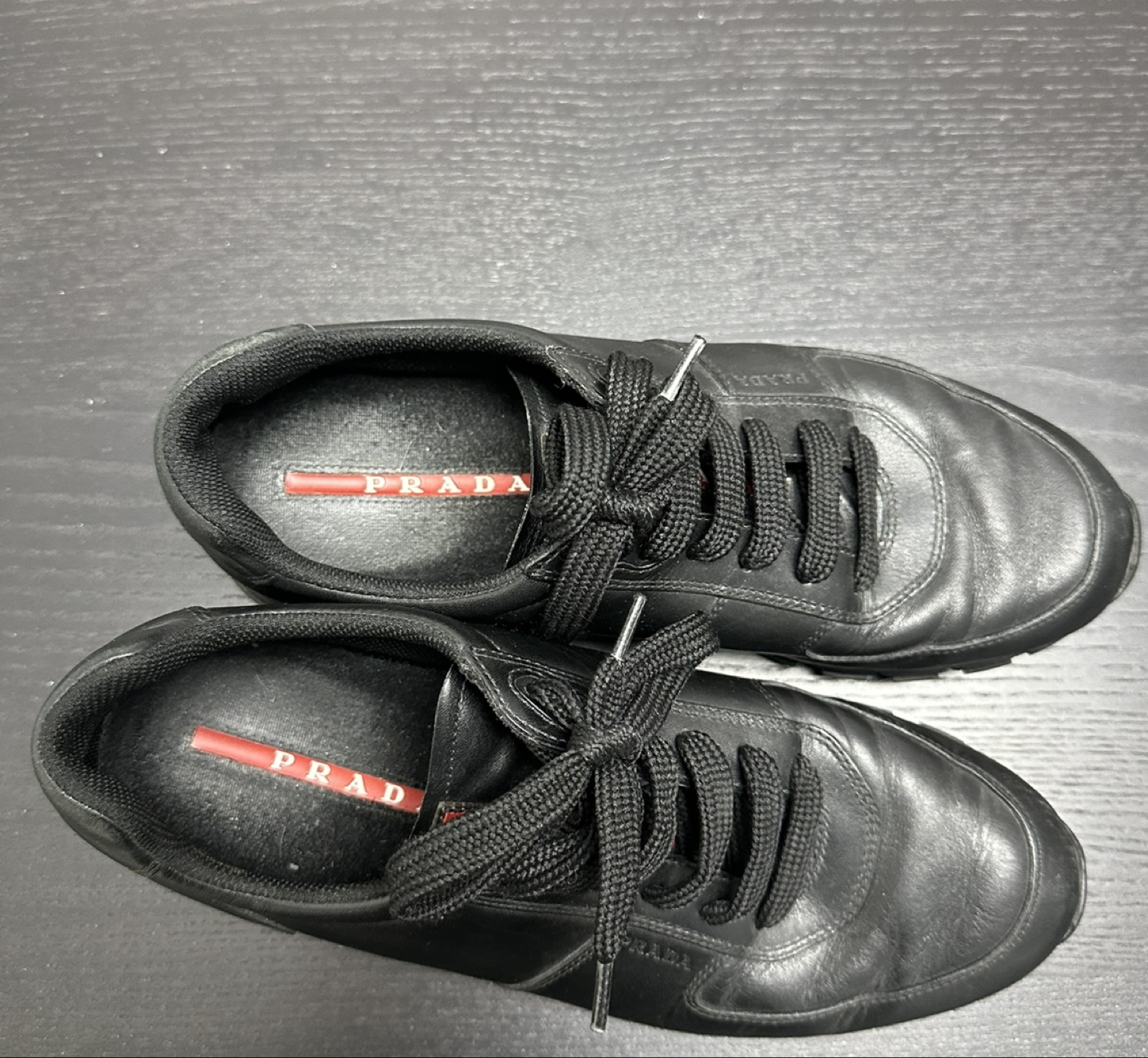 Here are some gently used Prada sneakers! They are black leather with black laces and a rugged sole. The insole has the Prada logo on it. Perfect for everyday wear!