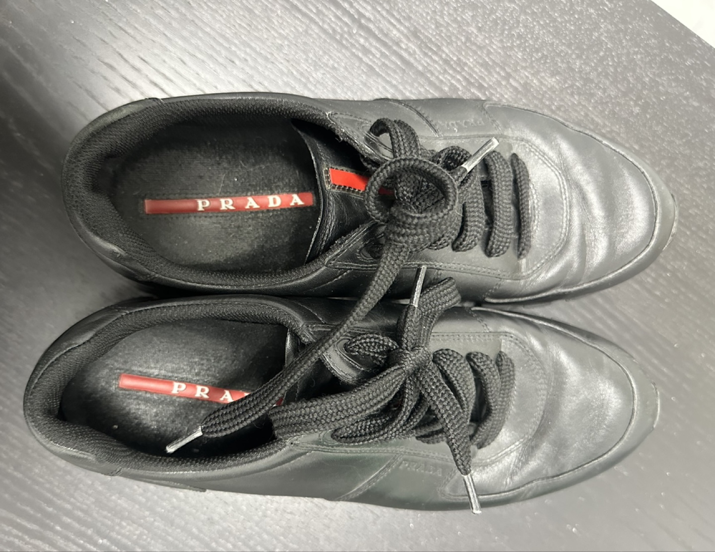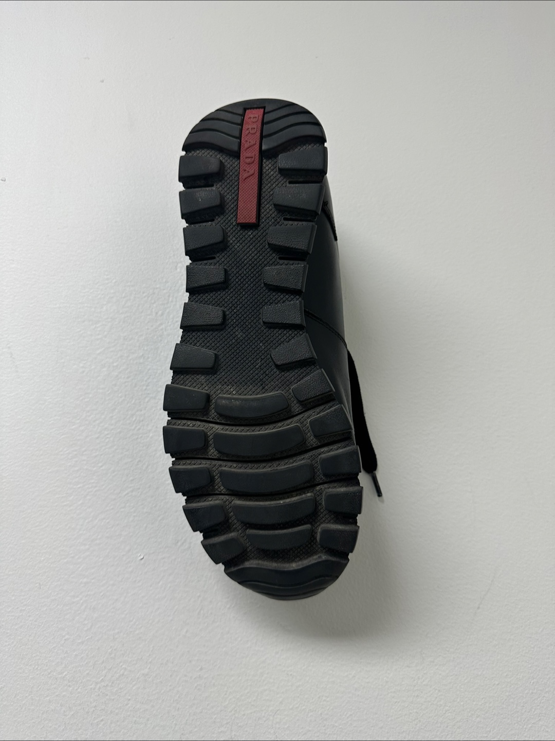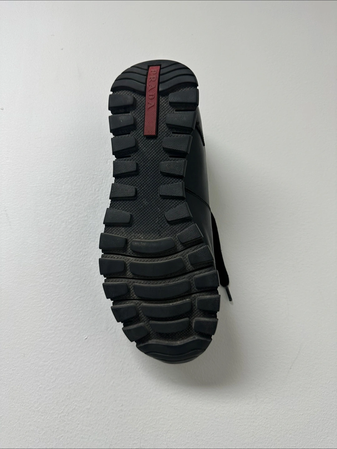 Here are some gently used Prada sneakers! They are black leather with black laces and a rugged sole. The insole has the Prada logo on it. Perfect for everyday wear!