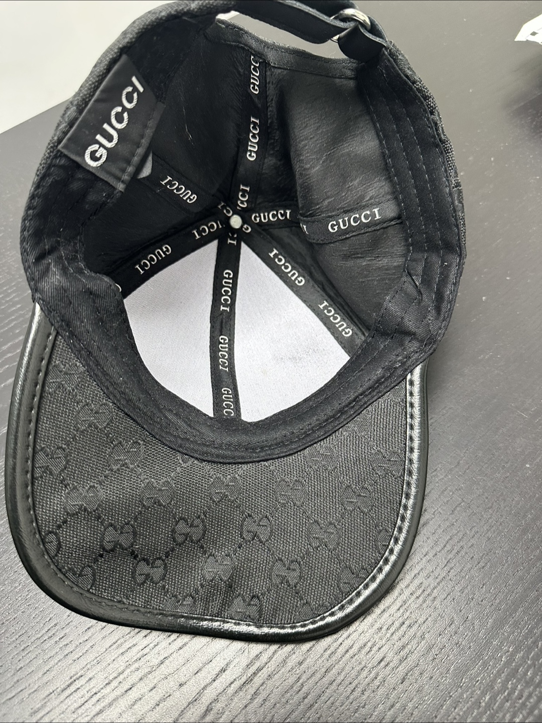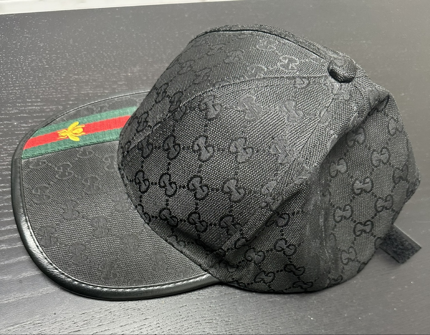 Selling a stylish Gucci baseball hat in black GG canvas. It features the iconic Gucci pattern throughout and the classic green and red web stripe with a bee detail on the brim. This hat is in great condition and ready to add a touch of luxury to your wardrobe!