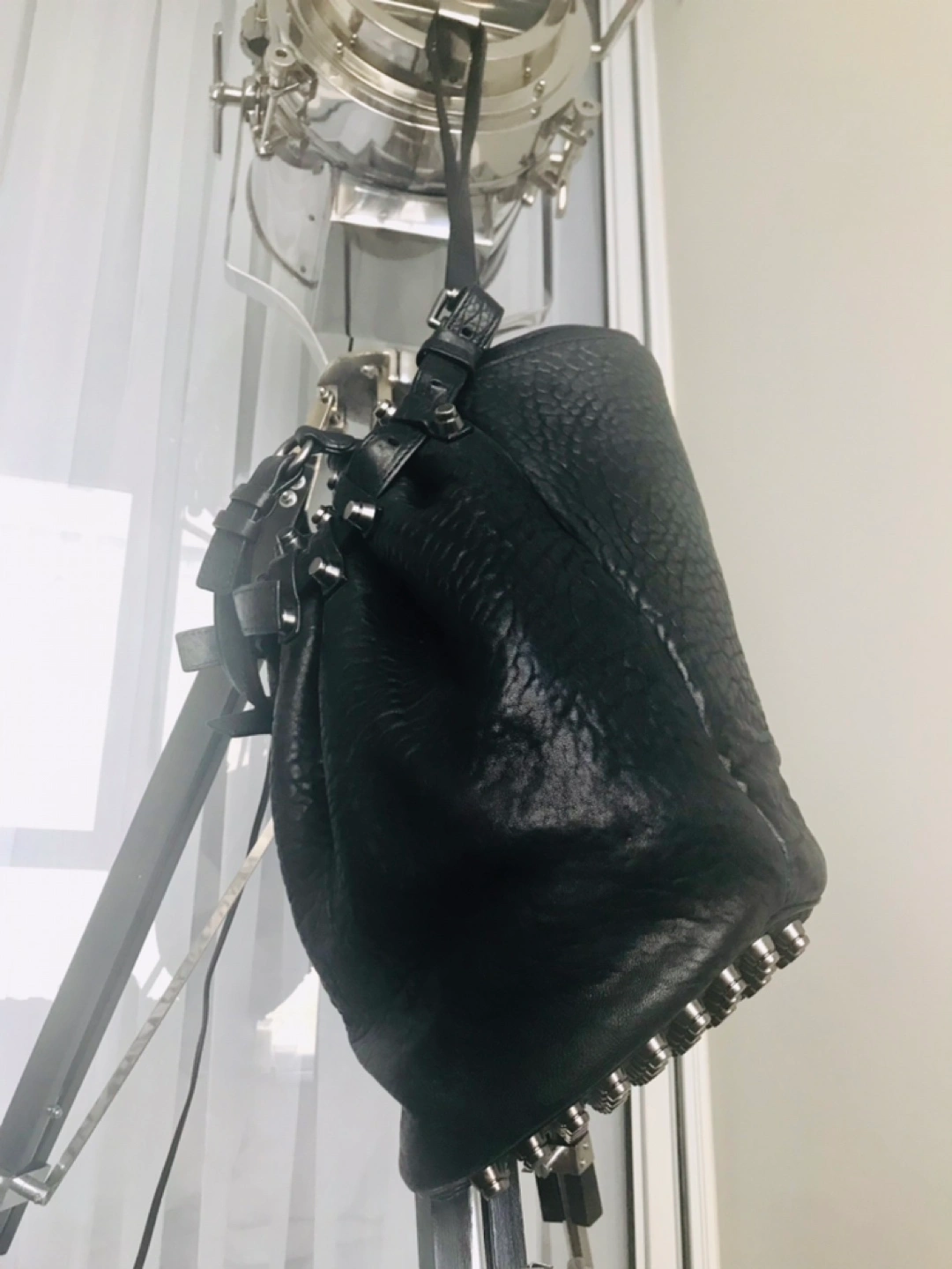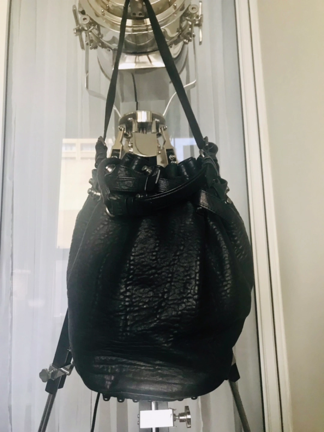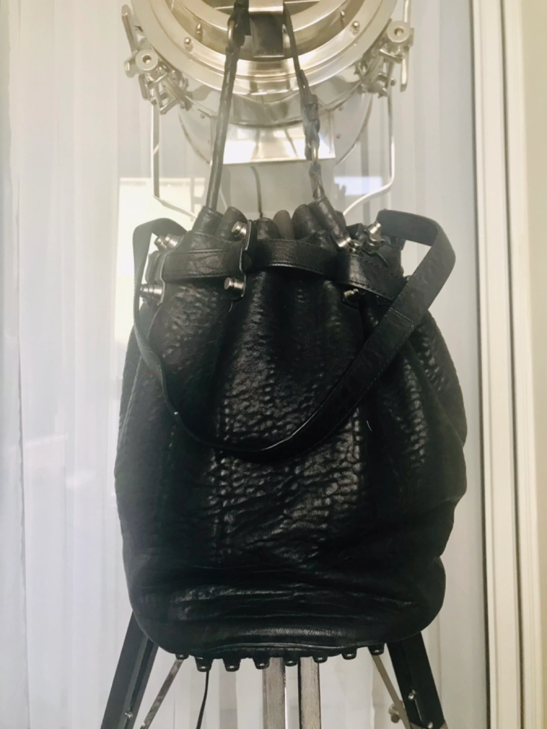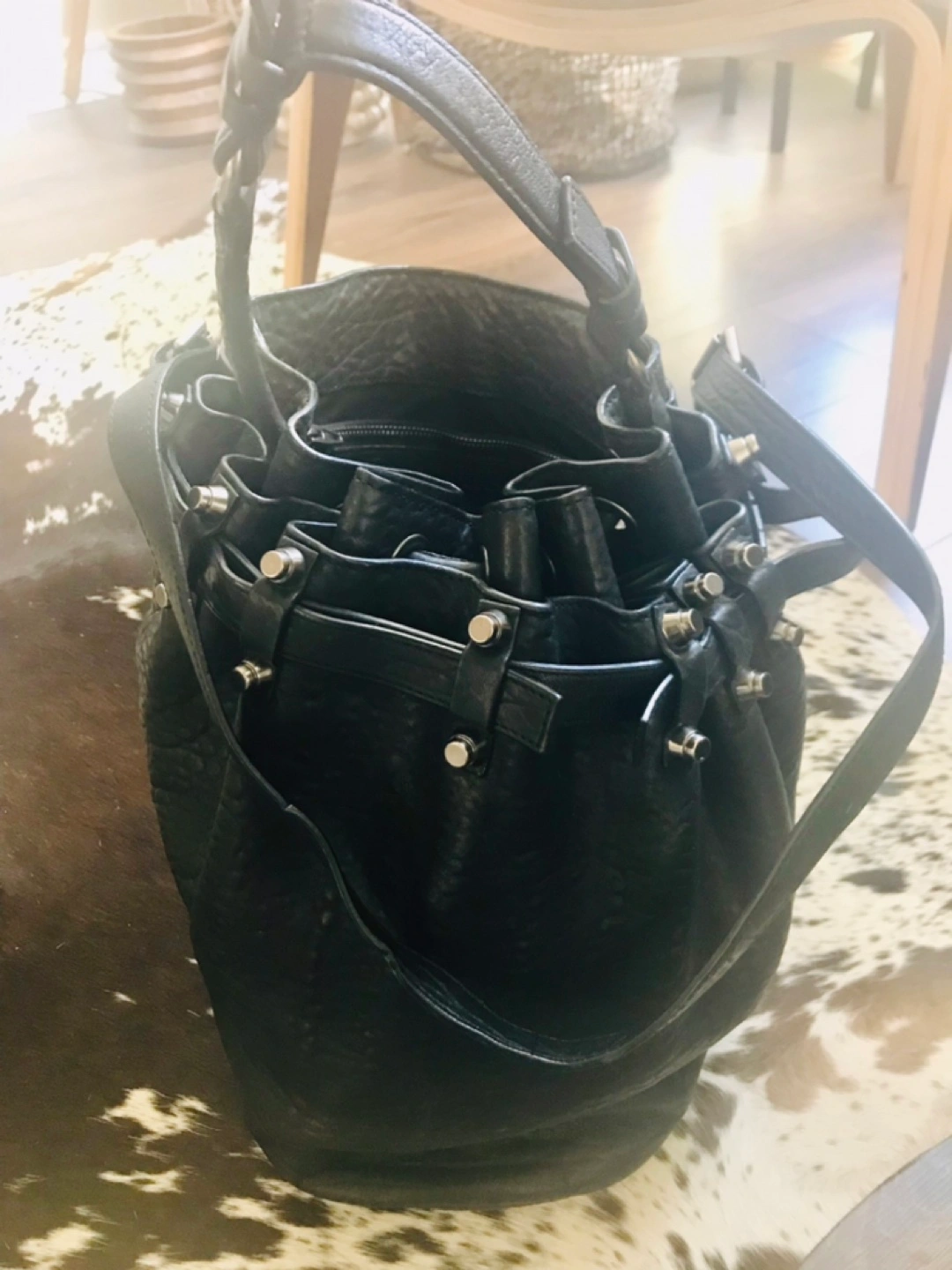 Alexander Wang Diego bucket bag, black pebbled leather, gunmetal studded hardware accents and protective base, adjustable top handle and shoulder strap, drawstring closure at top, nylon lining, 3 interior pockets, signs of wear on the straps but the bag is in excellent condition