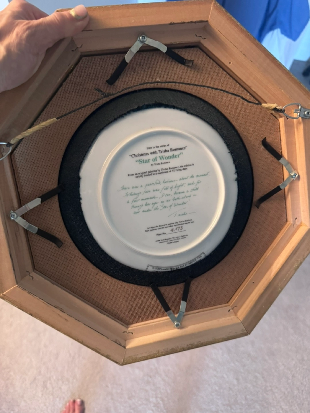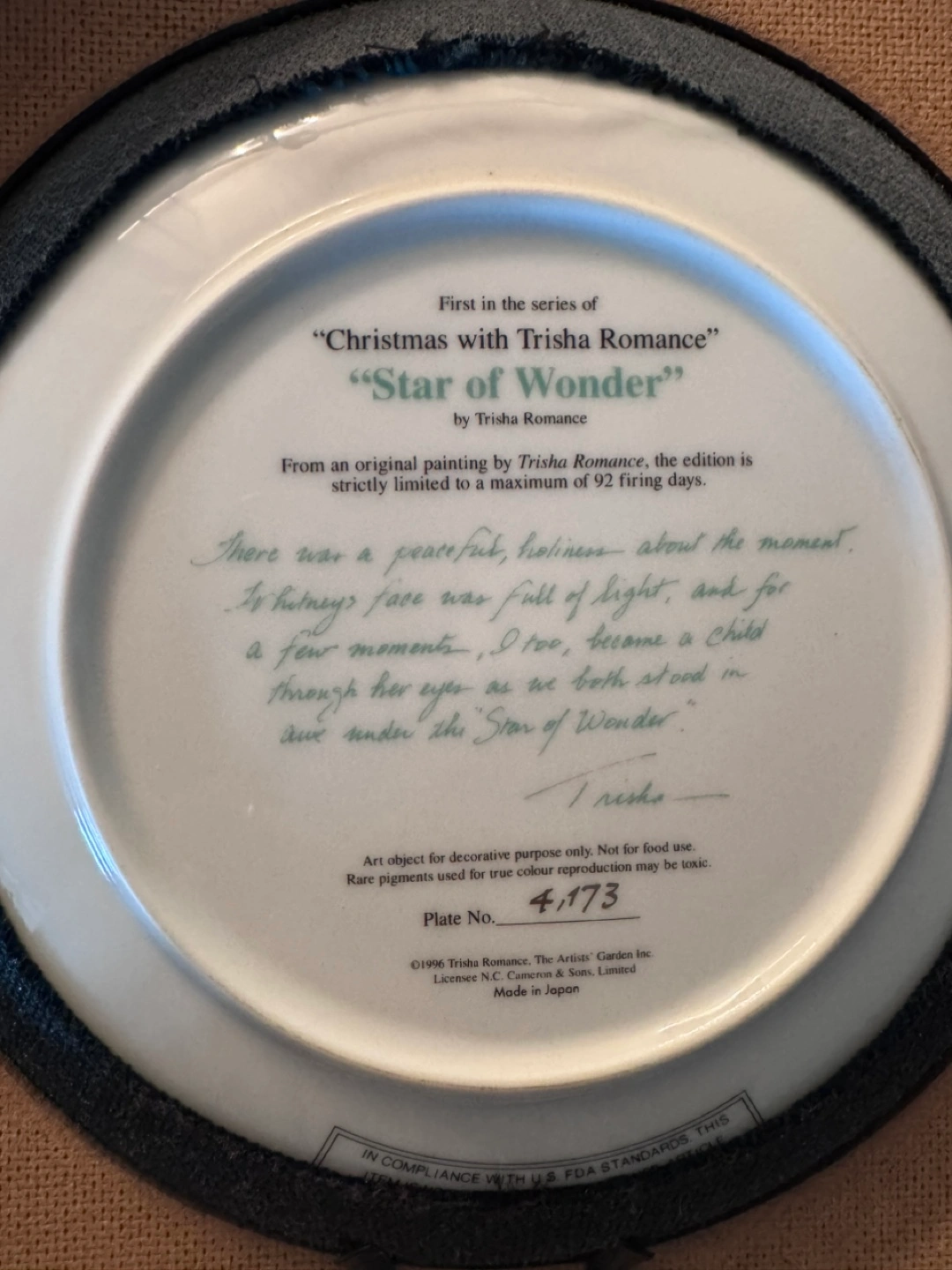 Selling a framed plate from the "Christmas with Trisha Romance" series, titled "Star of Wonder" by Trisha Romance. This plate is from an original painting and is strictly limited to a maximum of 92 firing days. It's a lovely piece for decorative purposes!