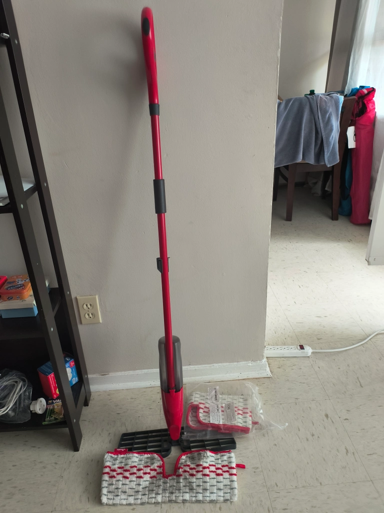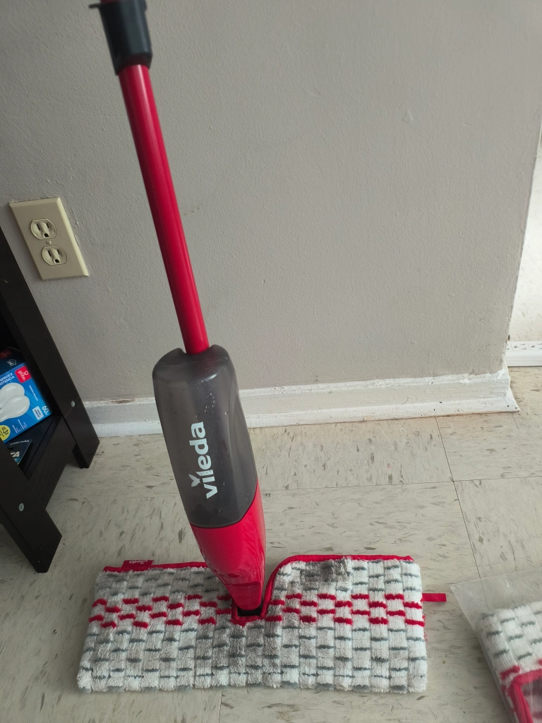 Selling a Vileda spray mop that's ready to help you keep your floors sparkling! It comes with a used mop head and an extra new mop head so you're all set for cleaning.